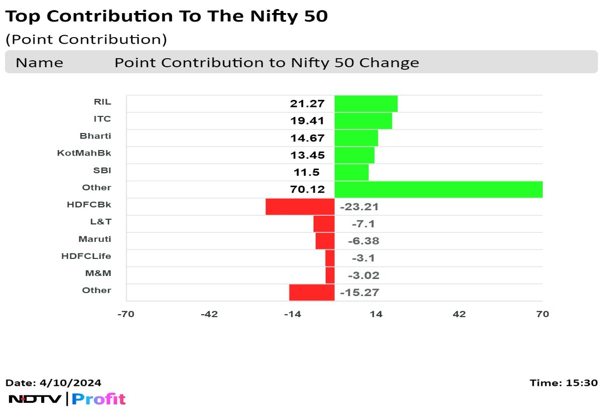Shares of Reliance Industries Ltd., ITC Ltd., Bharti Airtel Ltd., Kotak Mahindra Bank Ltd. and State Bank of India contributed the most to the gains in the Nifty 50.