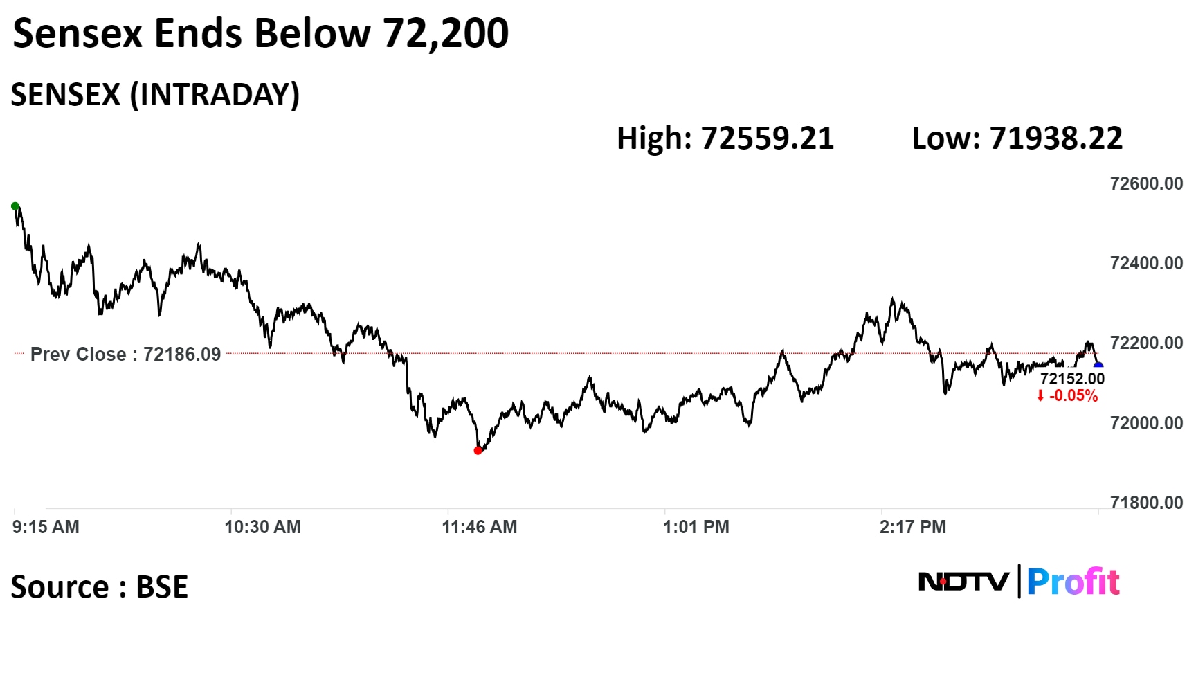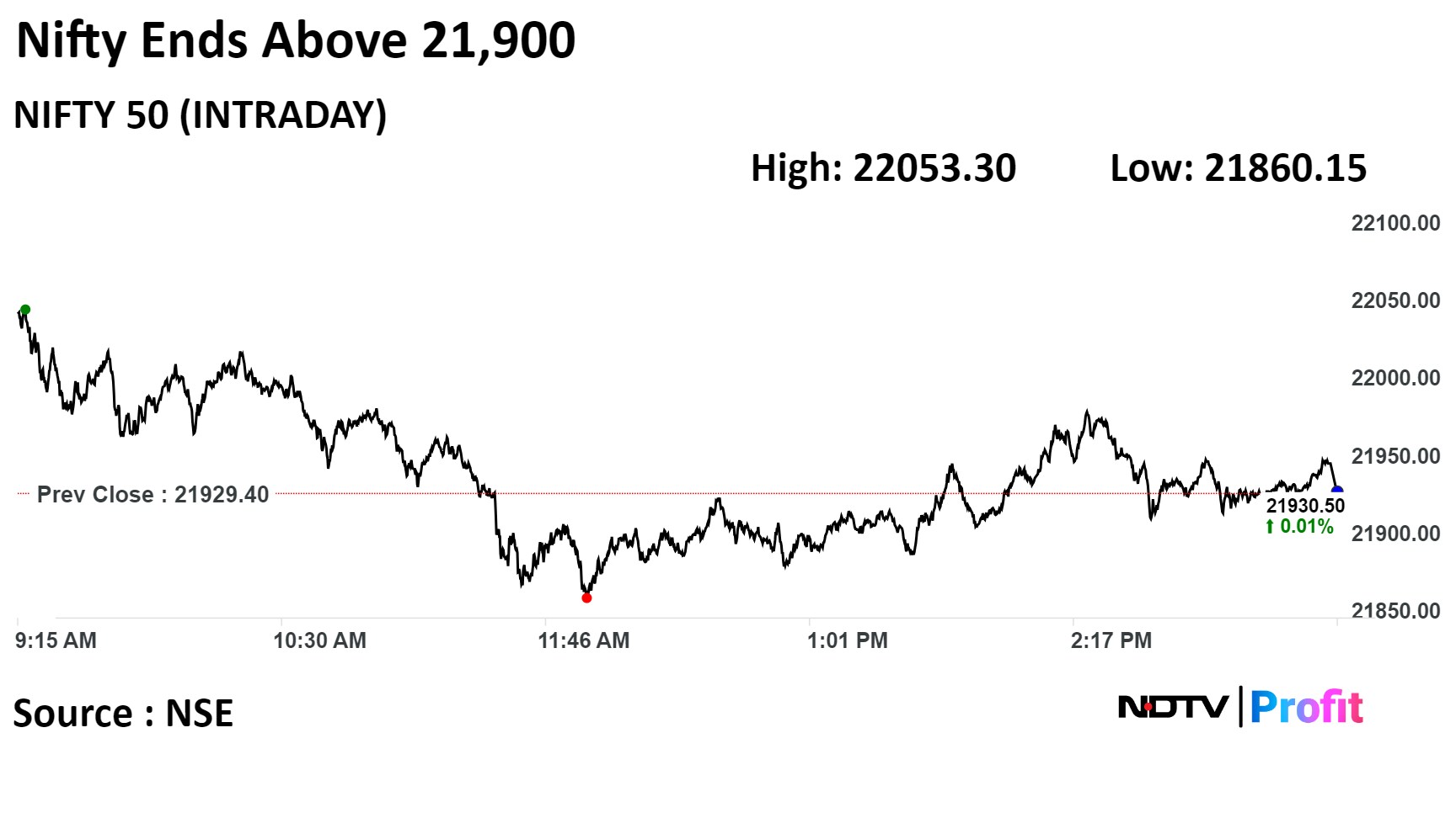 The NSE Nifty 50 settled 1.10 points or 0.01%, higher at 21,930.50, while the S&P BSE Sensex fell 34.09 points or 0.05%, to 72,152.
