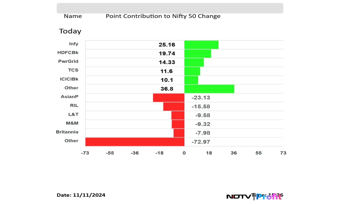 Shares of Infosys Ltd., HDFC Bank Ltd., Power Grid Corp. of India, Tata Consultancy Services Ltd., and ICICI Bank Ltd. positively contributed to changes in the Nifty 50.