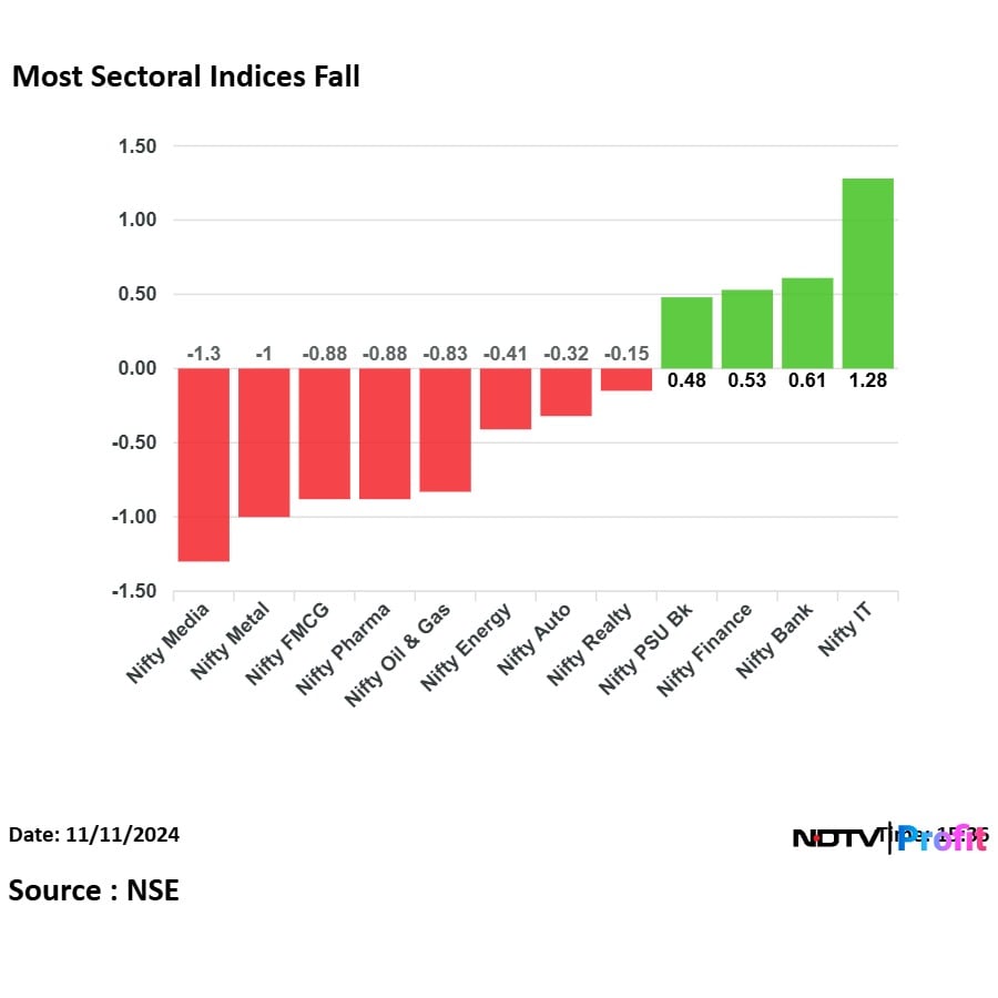 On NSE, eight out of 12 sectors declined and four advanced. The NSE Nifty Media declined the most, and the NSE Nifty IT rose the most.