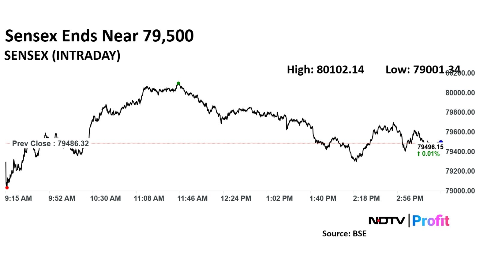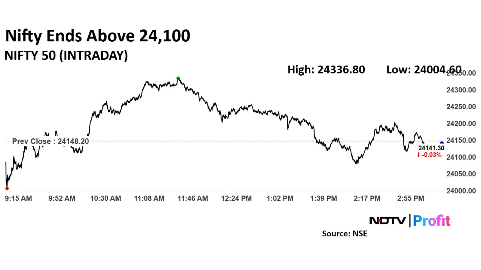 The Nifty 50 ended 6.90 points, or 0.03% lower at 24,141.30, and the Sensex ended 9.83 points, or 0.01% higher at 79,496.15.