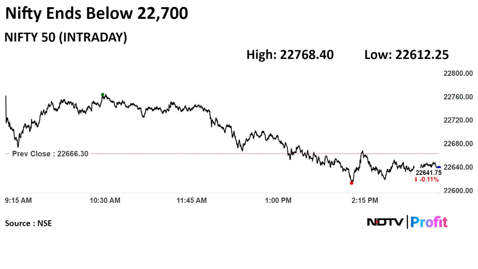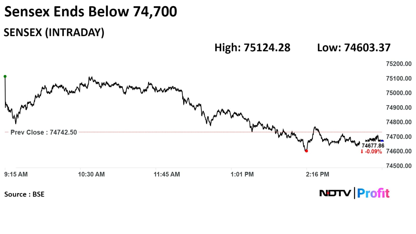 The NSE Nifty 50 ended 24.55 points, or 0.11%, lower at 22,641.75, and the S&P BSE Sensex closed 58.80 points, or 0.079%, down at 74,683.70. The NSE Nifty 50 rose to a fresh high of 22,768.40, and the S&P BSE Sensex gained to a record 75,124.28.