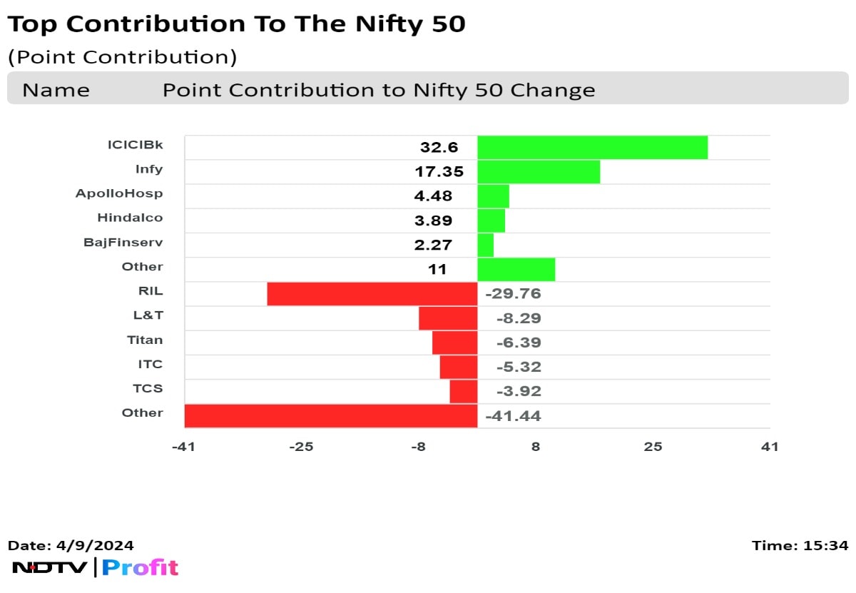 ICICI Bank Ltd., Infosys Ltd., Apollo Hospitals Enterprises Ltd., Hindalco Industries Ltd., and Bajaj Finserve Ltd. added to the gains in the index.