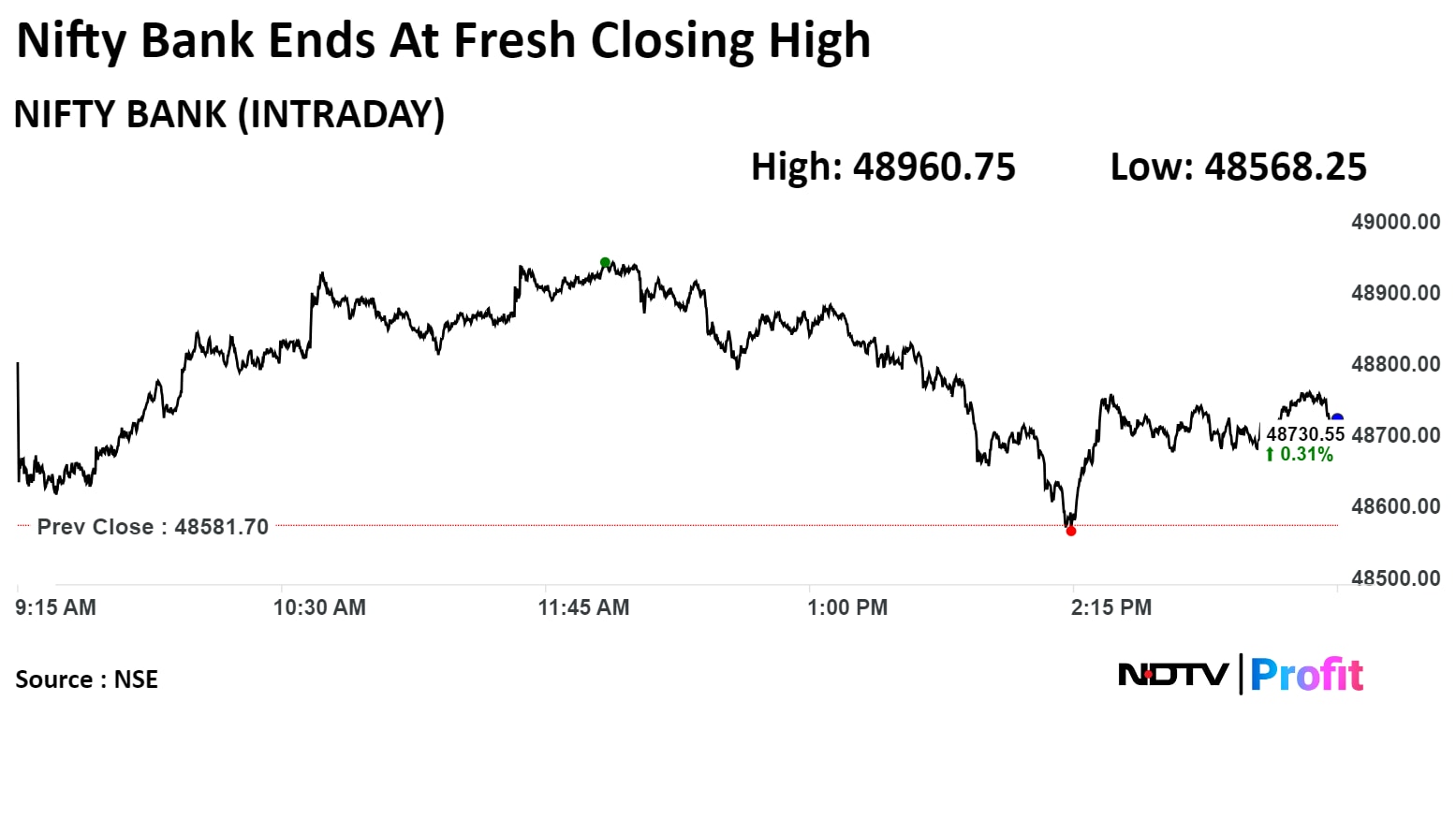 The NSE Nifty Bank index also scaled to a fresh high of 48,960.75, led by gains in ICICI Bank Ltd. and Axis Bank Ltd.