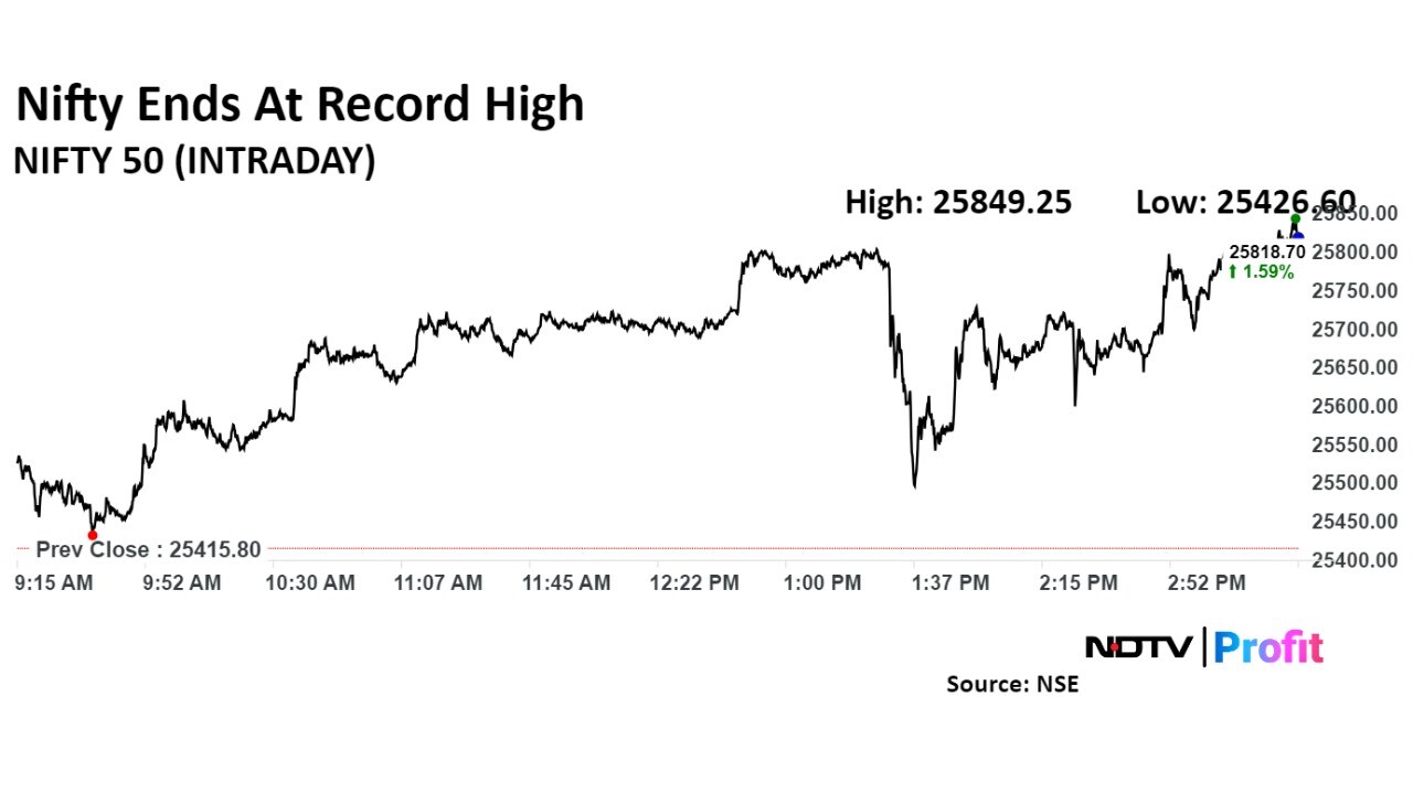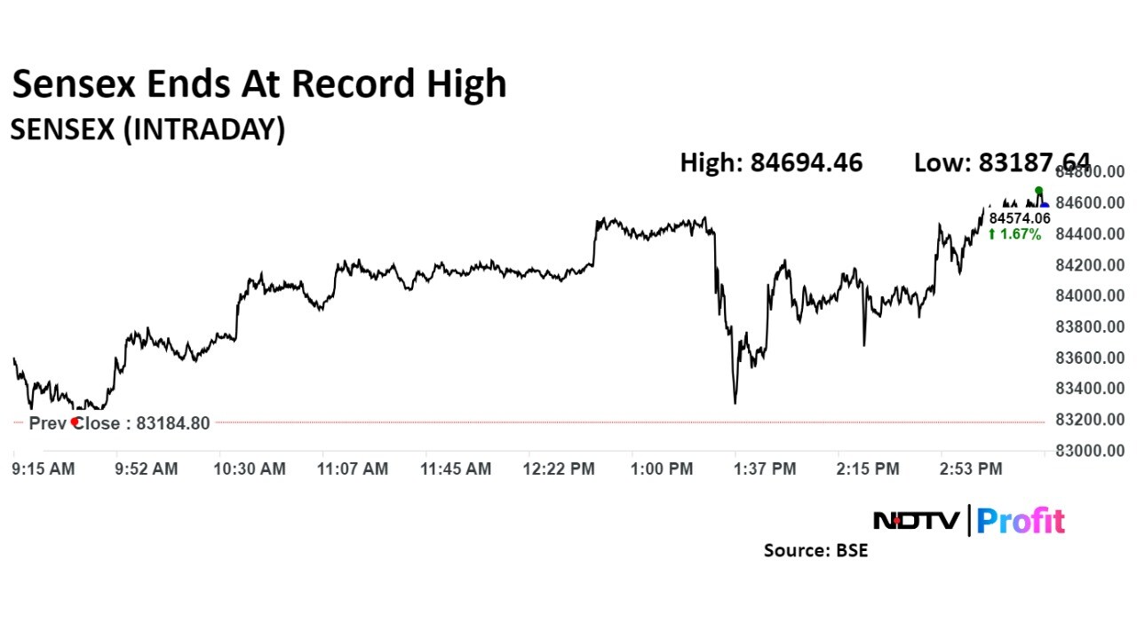 The NSE Nifty 50 ended 375.15 points or 1.48% higher at 25,790.95, while the S&P BSE Sensex closed 1,359.51 points or 1.63% up at 84544.31.