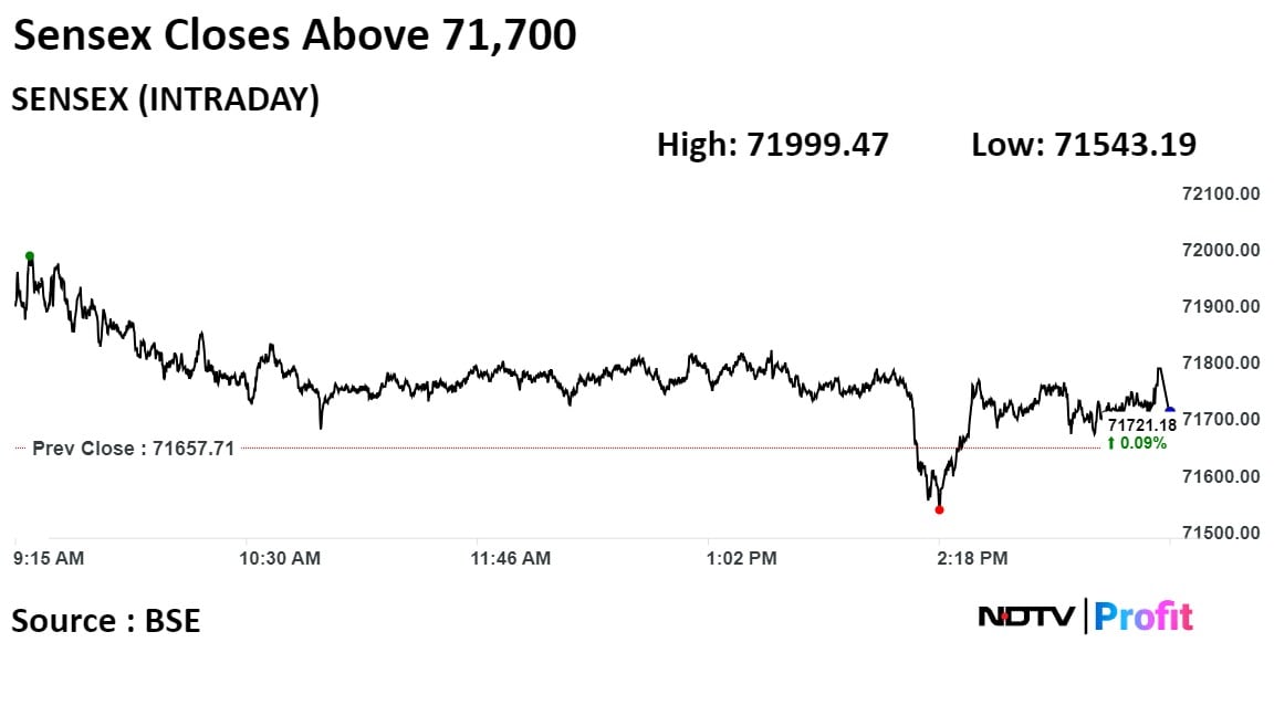 The NSE Nifty 50 ended 0.13%, or 28.50 points, higher at 21,647.20, while the S&P BSE Sensex ended 0.089%, or 63.47 points, up at 71,721.18.