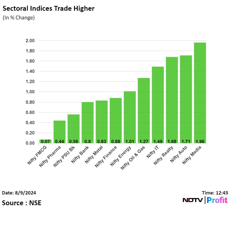 All sectoral indices traded in the green led by Nifty Media, while Nifty FMCG rose the least.