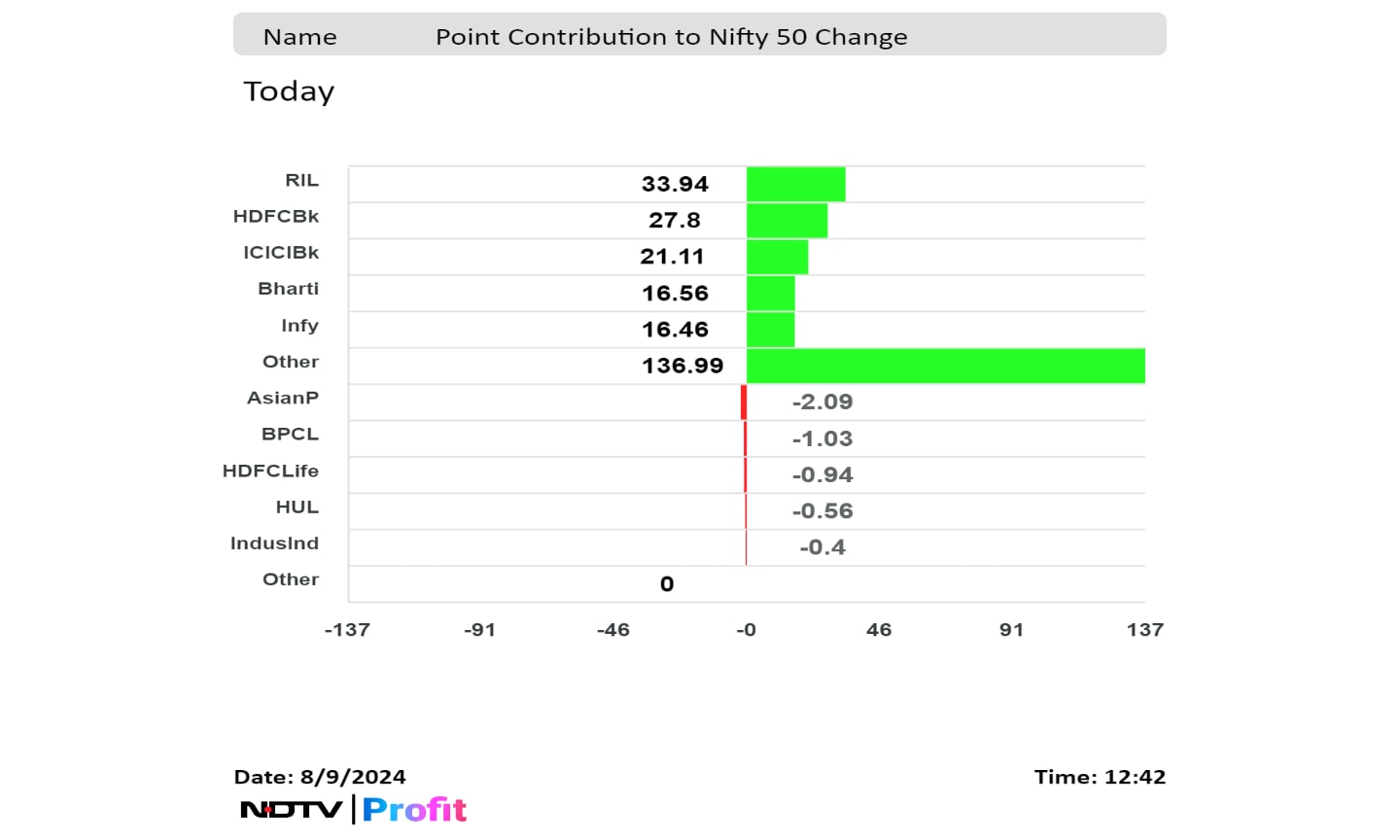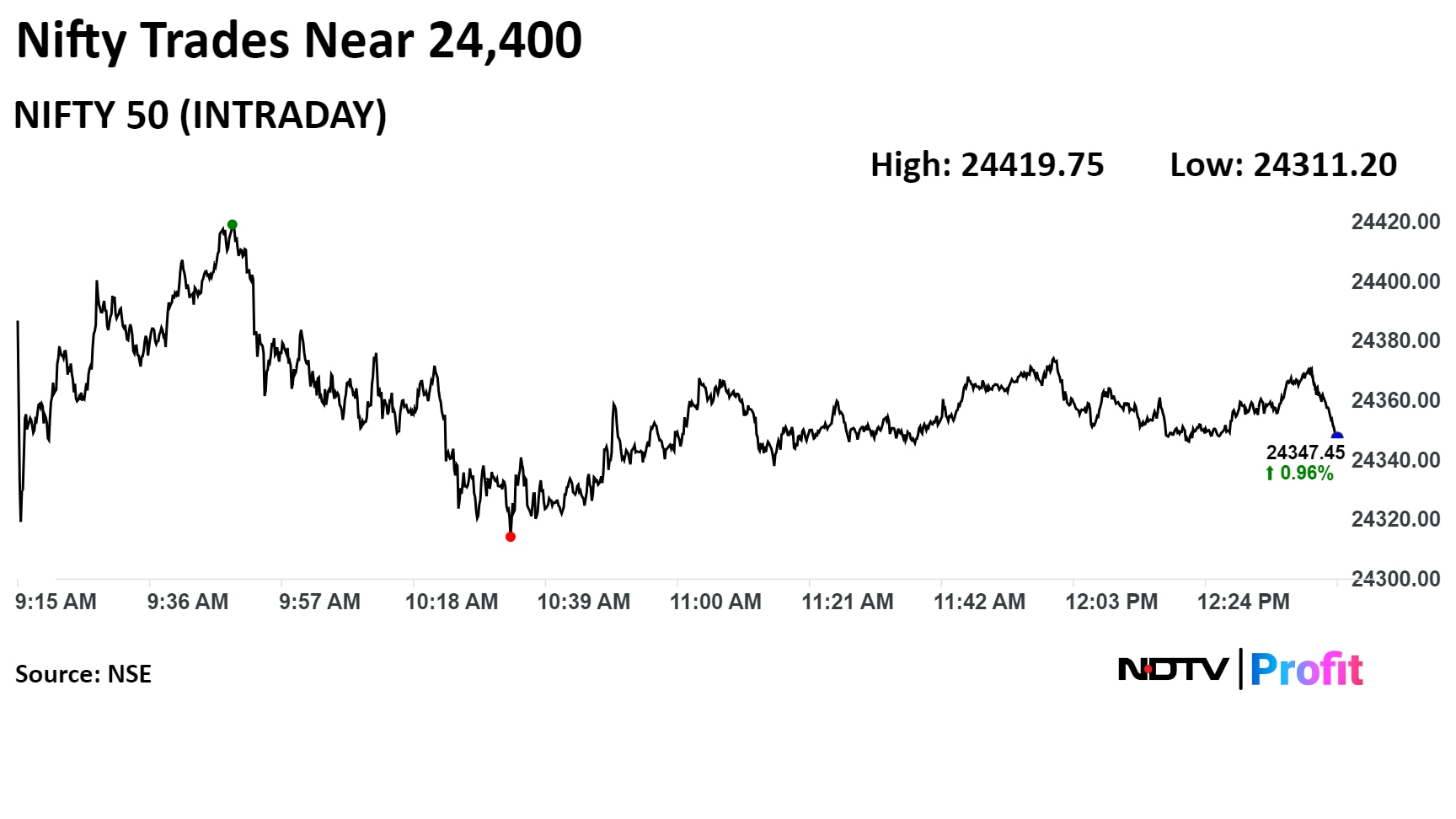 At 12:47 p.m., the Nifty was trading 0.98%, or 236.60 points, higher at 24,353.60, and the Sensex gained 0.99%, or 784.56 points, to trade at 79,670.78.