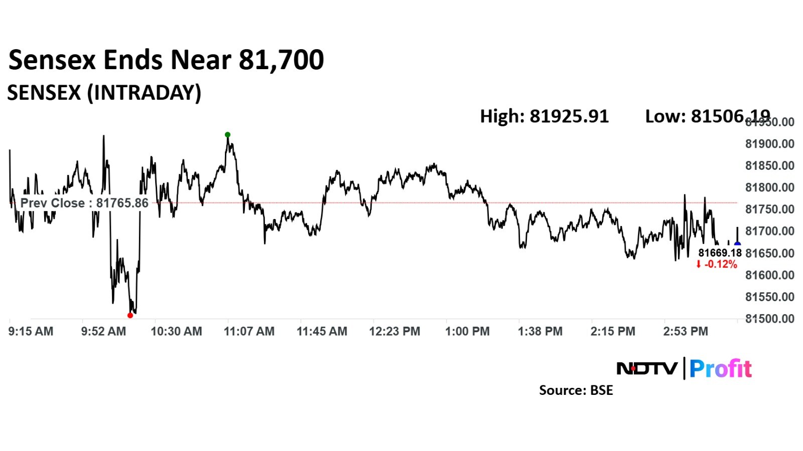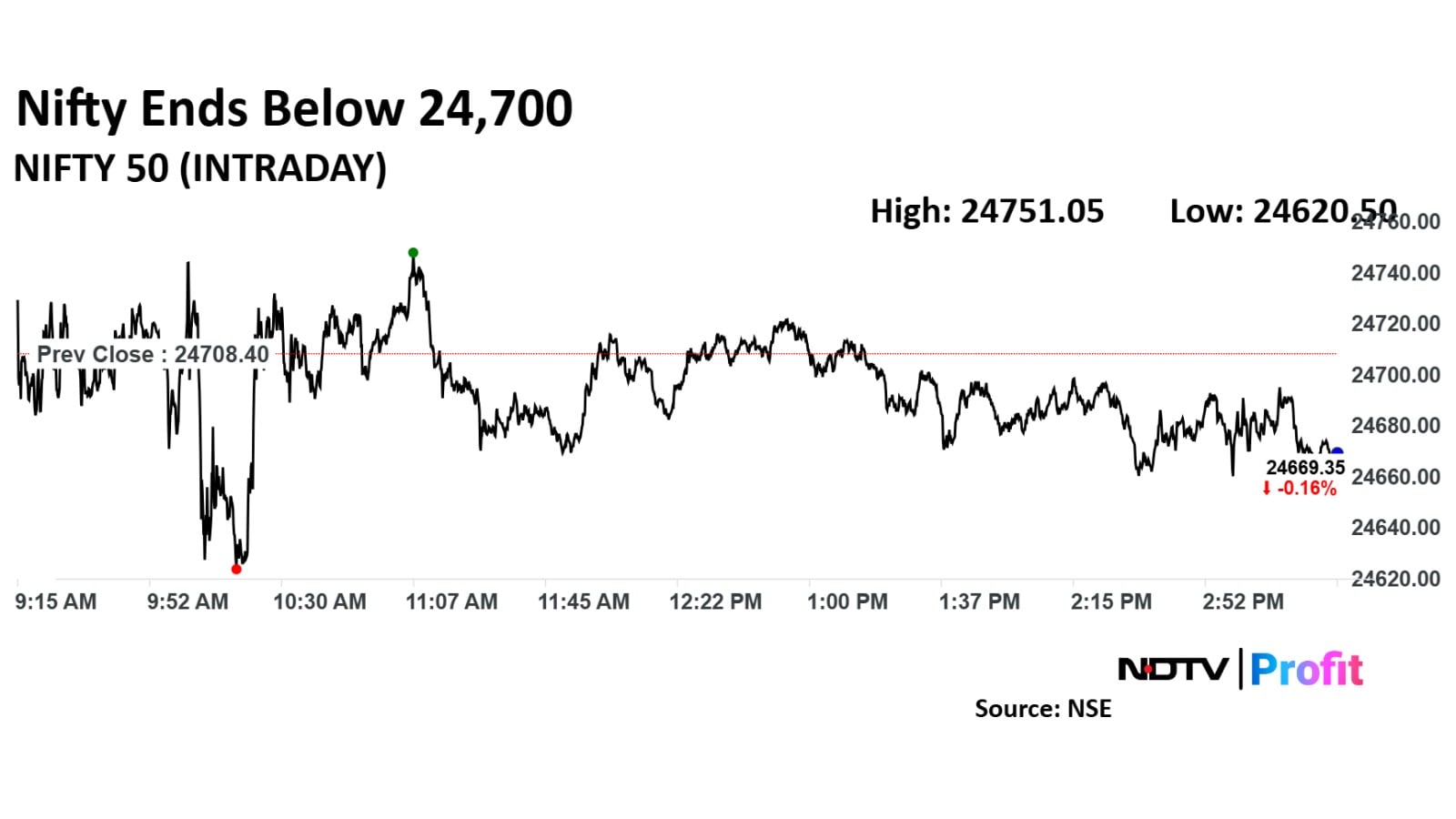 The Nifty 50 ended 39.05 points or 0.16% down at 24,669.35, and the Sensex ended 56.74 points or 0.07% down at 81,709.12.