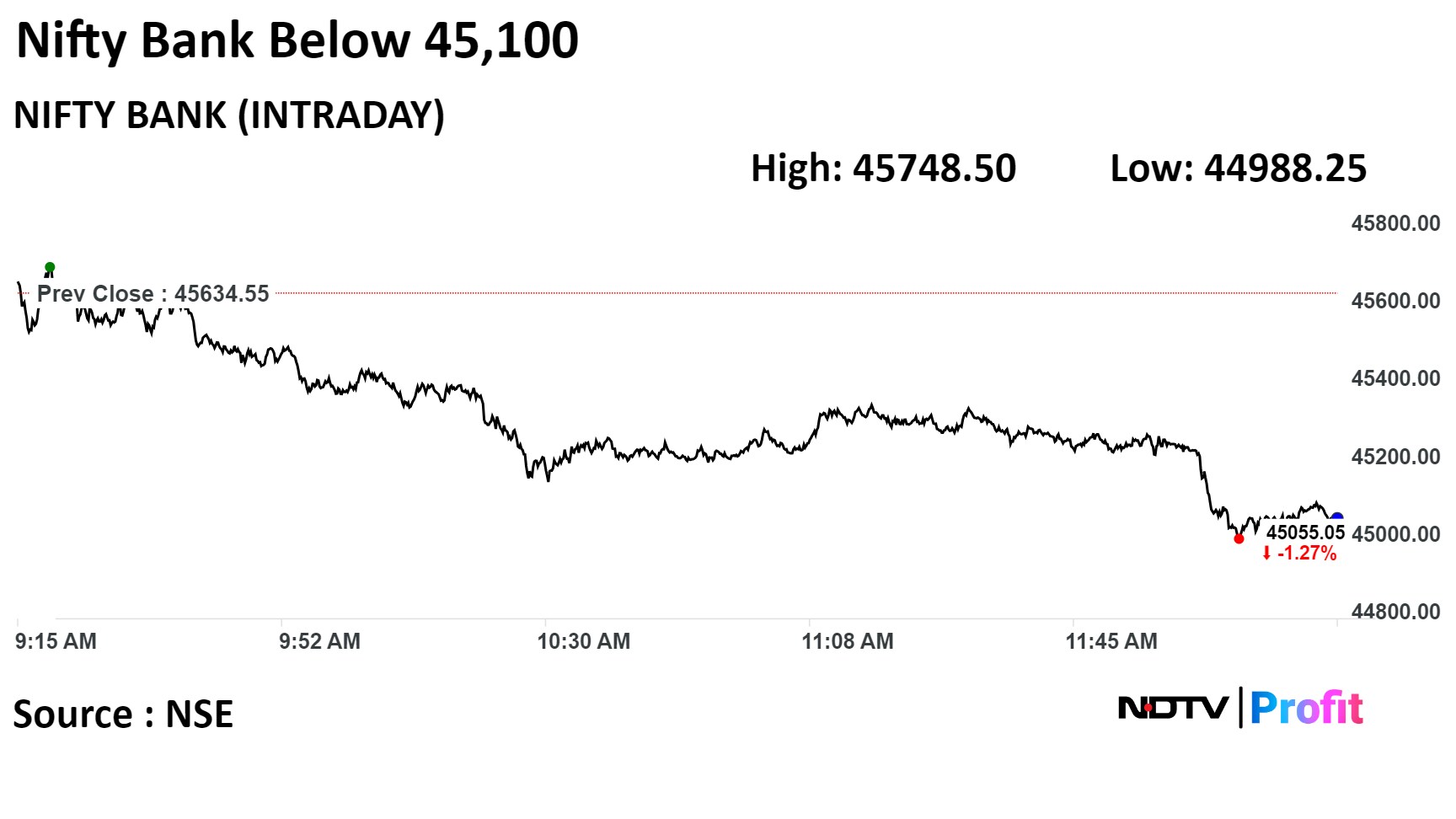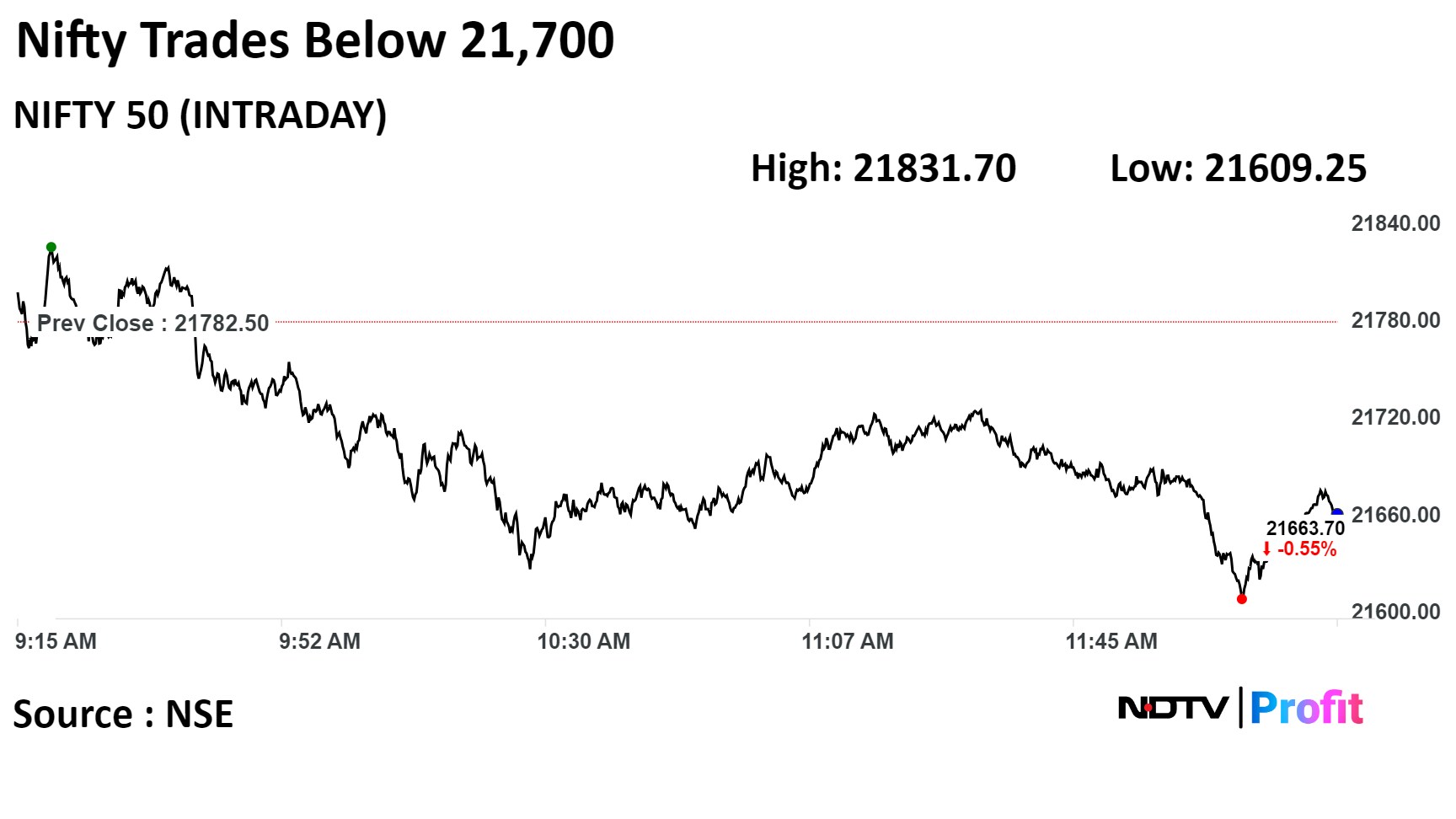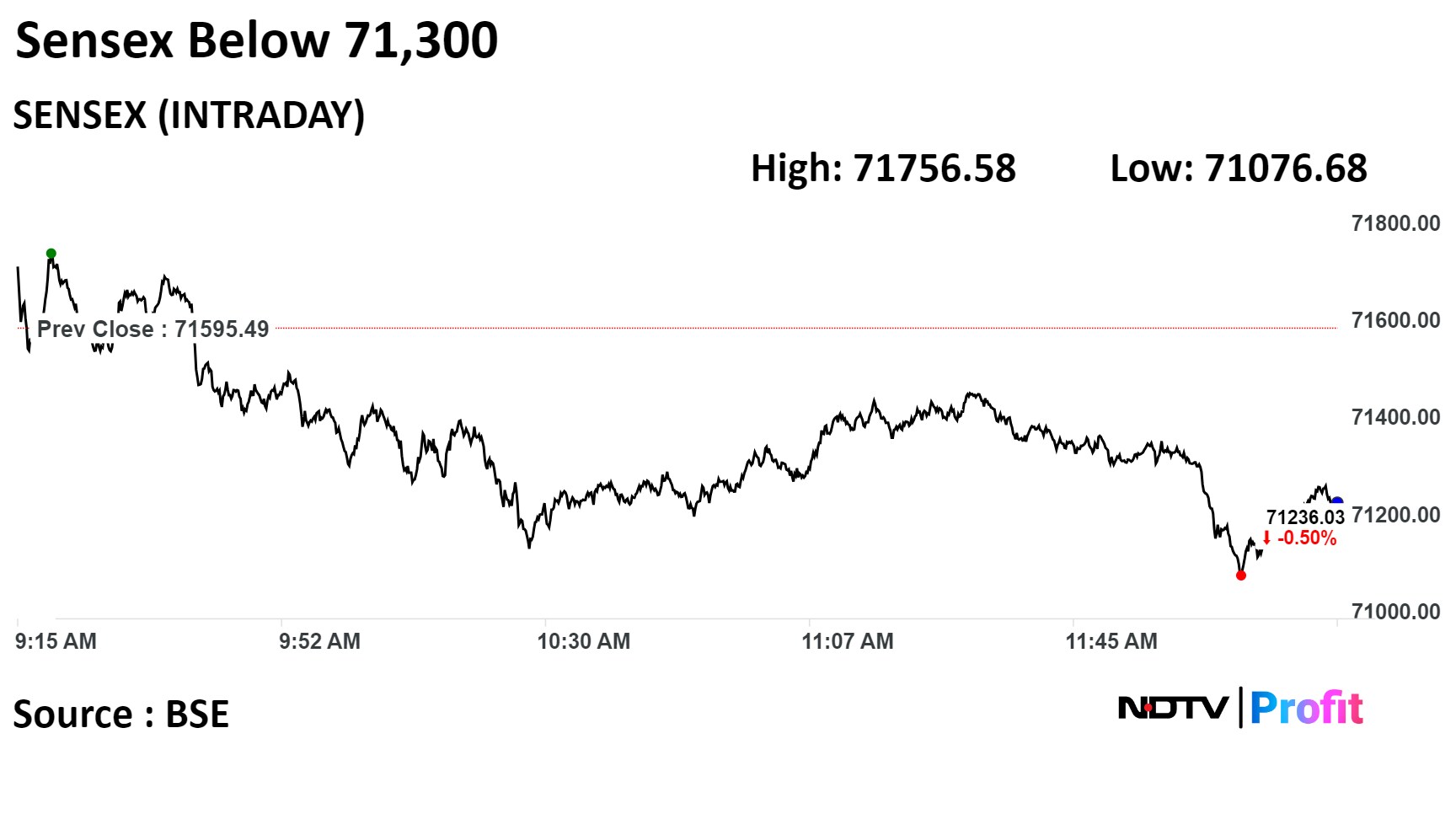 As of 12:23 p.m., the NSE Nifty 50 fell 114.65 points, or 0.53%, to 21,667.85, while the S&P BSE Sensex declined 351.79 points, or 0.49%, to 71,243.70.