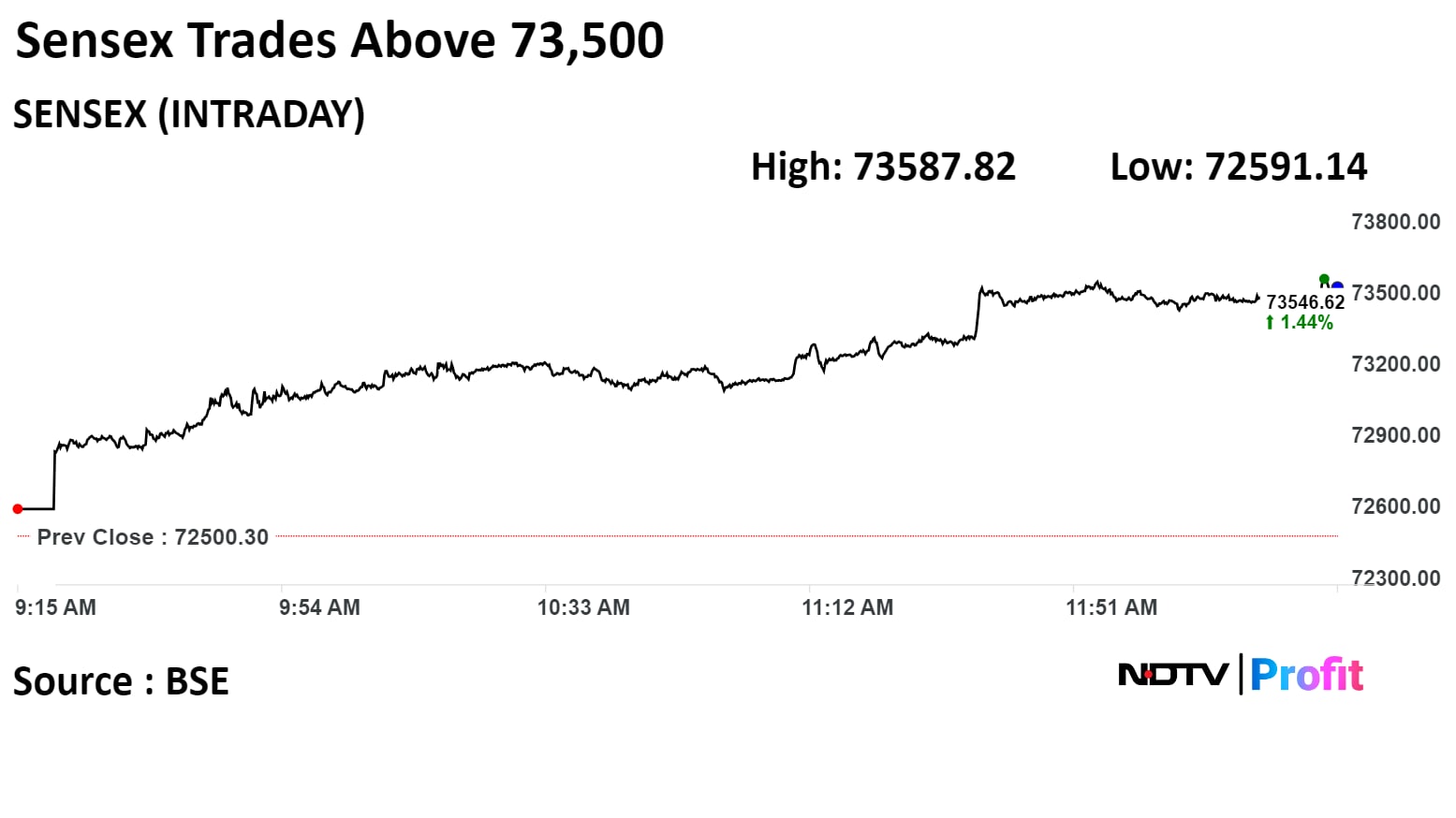 As of 12:37 p.m., the NSE Nifty 50 was 310.90 points, or 1.41% higher at 22,293.70, and the S&P BSE Sensex gained 1,042.92 points, or 1.44%, to trade at 73,543.22.