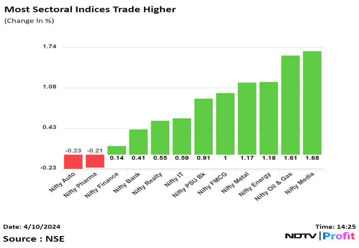 On NSE, 10 sectors advanced, and two declined out of 12. The NSE Nifty Oil & Gas sector rose the most, and the NSE Nifty Pharma sector declined the most.