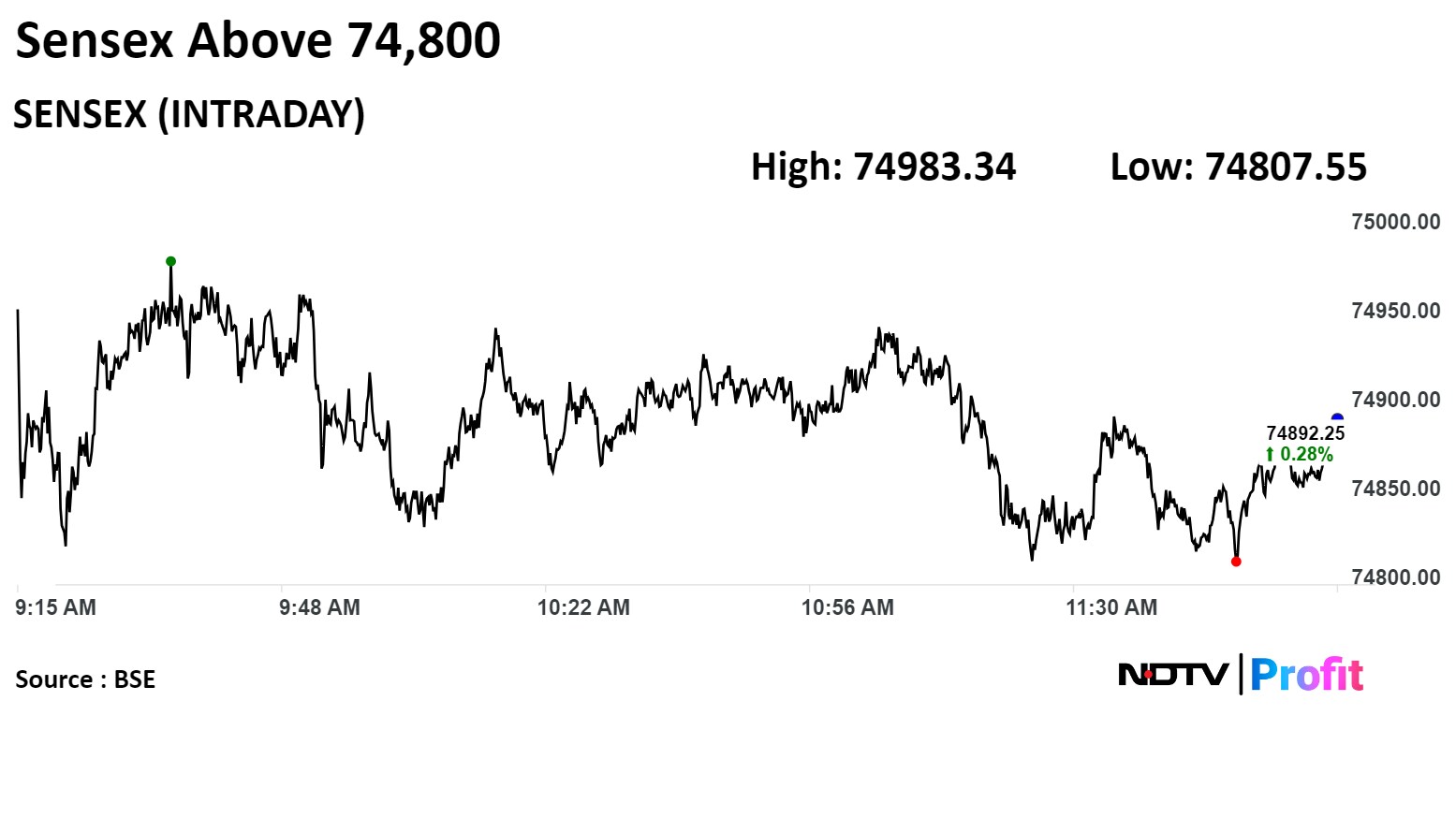 As of 12:08 p.m., the NSE Nifty 50 was trading 58.00 points, or 0.26%, higher at 22,700.75, and the S&P BSE Sensex gained 219.95 points, or 0.29%, to trade at 74,903.65.