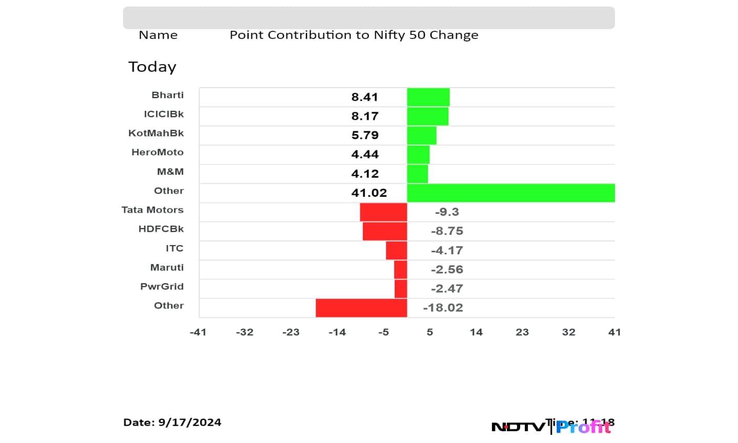 Shares of Bharti Airtel Ltd., ICICI Bank Ltd., Kotak Mahindra Bank Ltd., Hero MotoCorp Ltd., and Mahindra & Mahindra Ltd. were positively contributing to the changes in the Nifty 50.