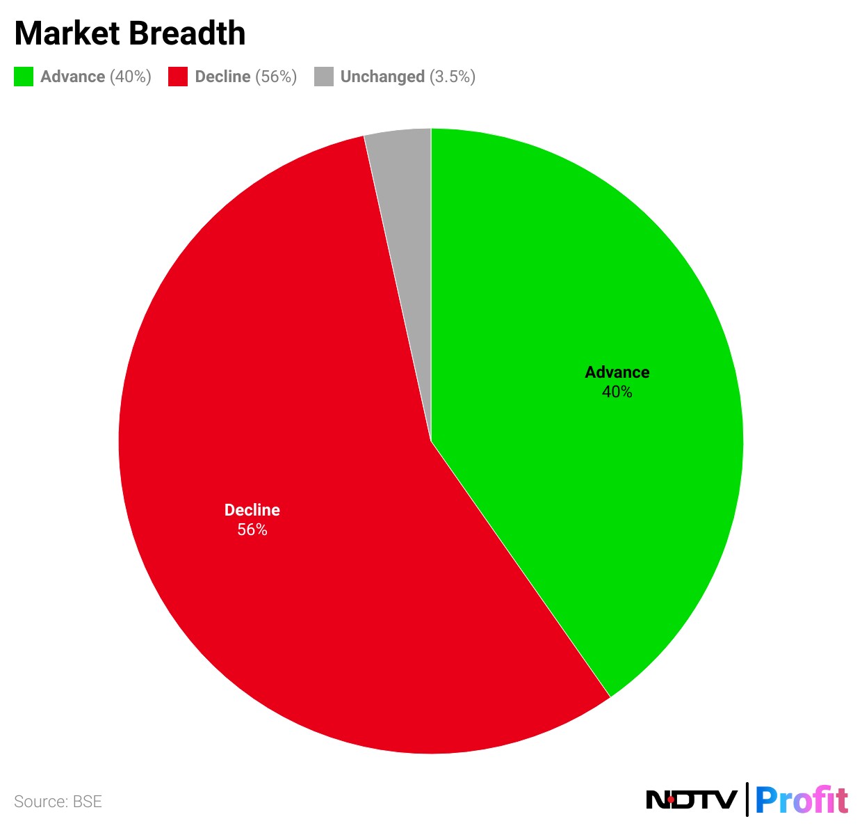 Around 1,575 stocks rose, 2,202 stocks declined, and 135 remained unchanged on the BSE.