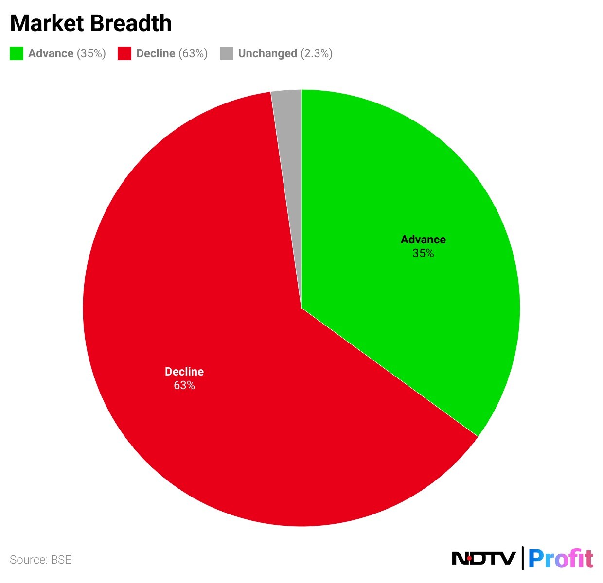 The market breadth was skewed in the favour of the sellers as 2,540 stocks fell, 1,407 rose and 87 remained unchanged on the BSE.