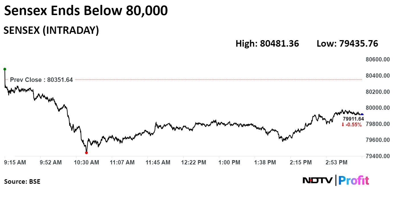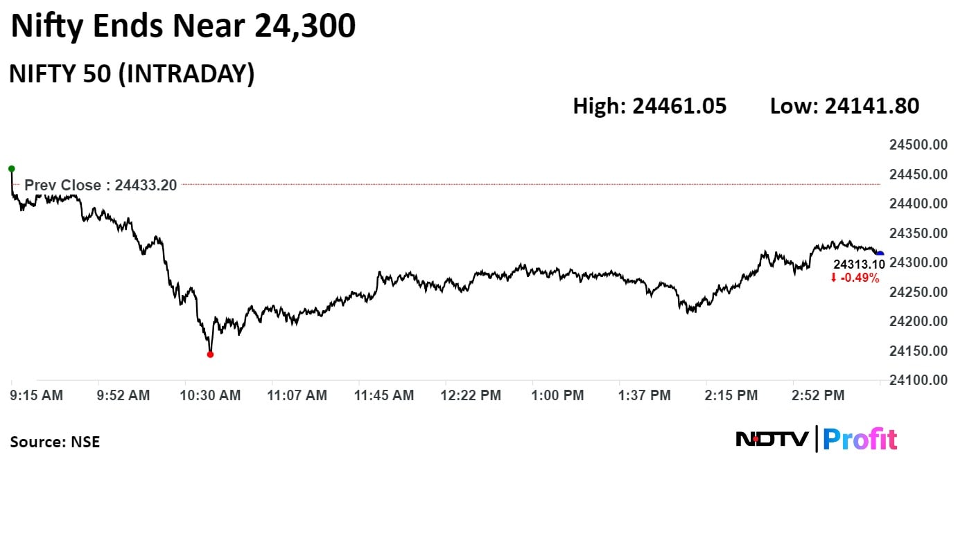 The NSE Nifty 50 closed 108.75 points or 0.45%, lower at 24,324.45, while the S&P BSE Sensex ended 426.87 points or 0.53%, lower at 79,924.77.
