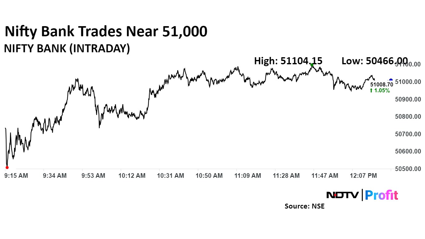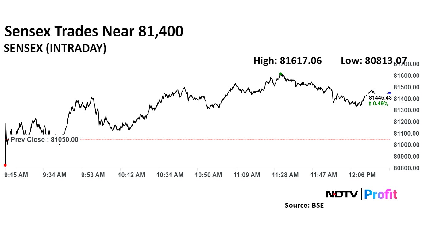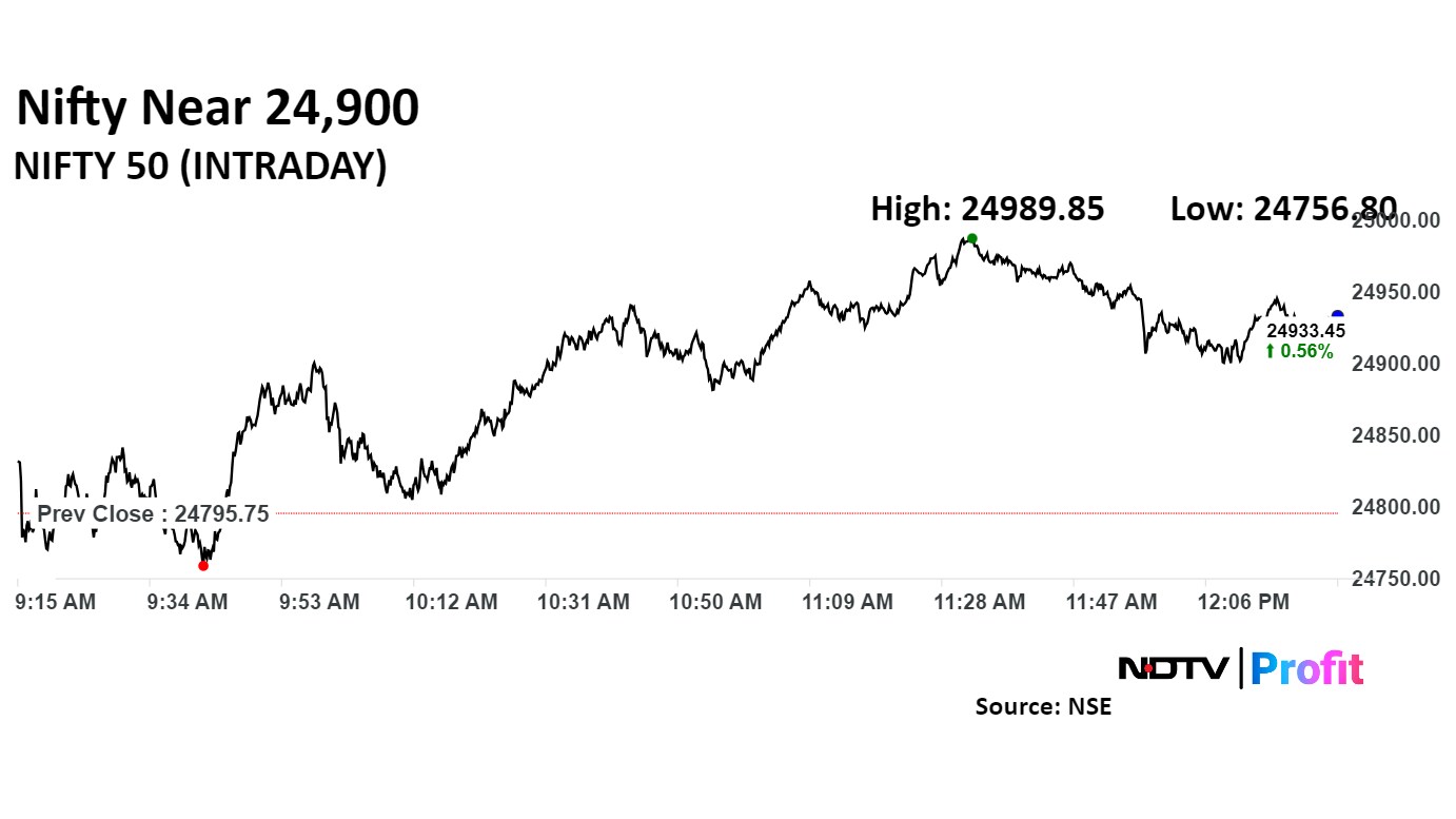 As of 12:39, the Nifty was trading 135.40 points, or 0.55%, higher at 24,931.15, and the Sensex was trading 386.68 points, or 0.48%, higher at 81,436.68.