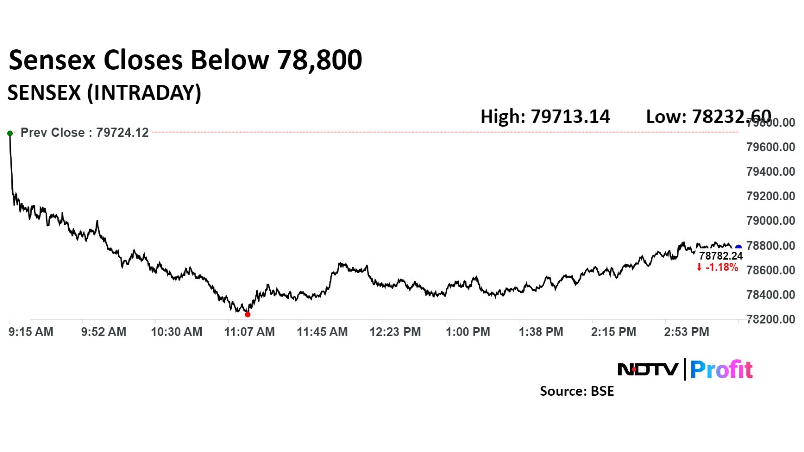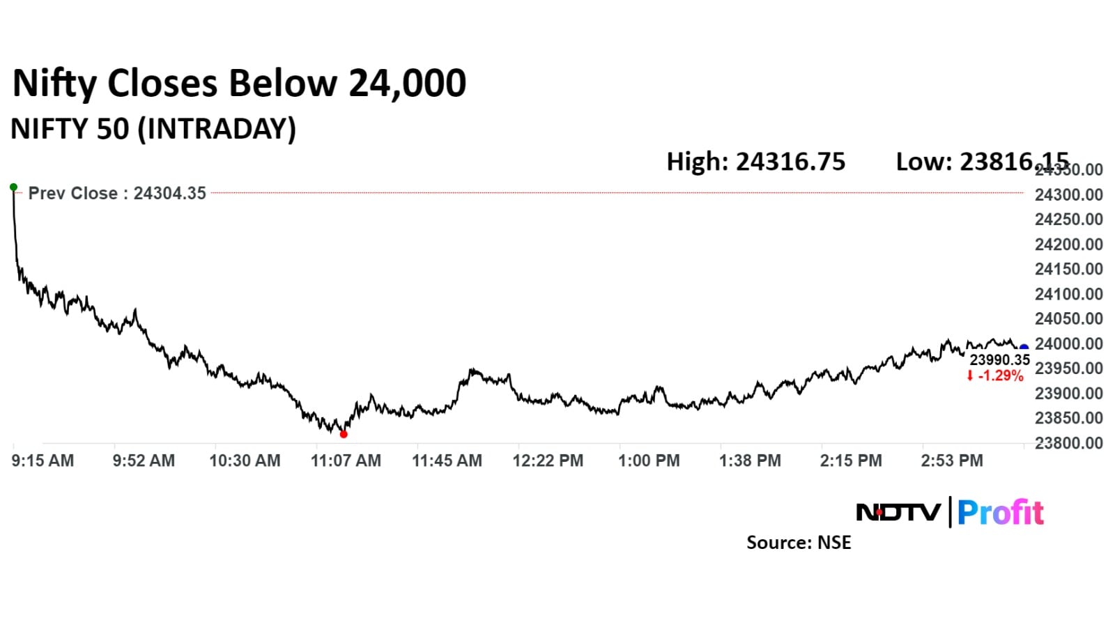 The Nifty 50 settled 309.00 points, or 1.27%, lower at 23,995.35, and the Sensex fell 941.88 points, or 1.18%, to end at 78,782.24. The Nifty fell as much as 2.01% during the day to 23,816.15—a first since Aug. 6. The Sensex declined 1.87% during the day to 78,232—its first since Aug. 14.