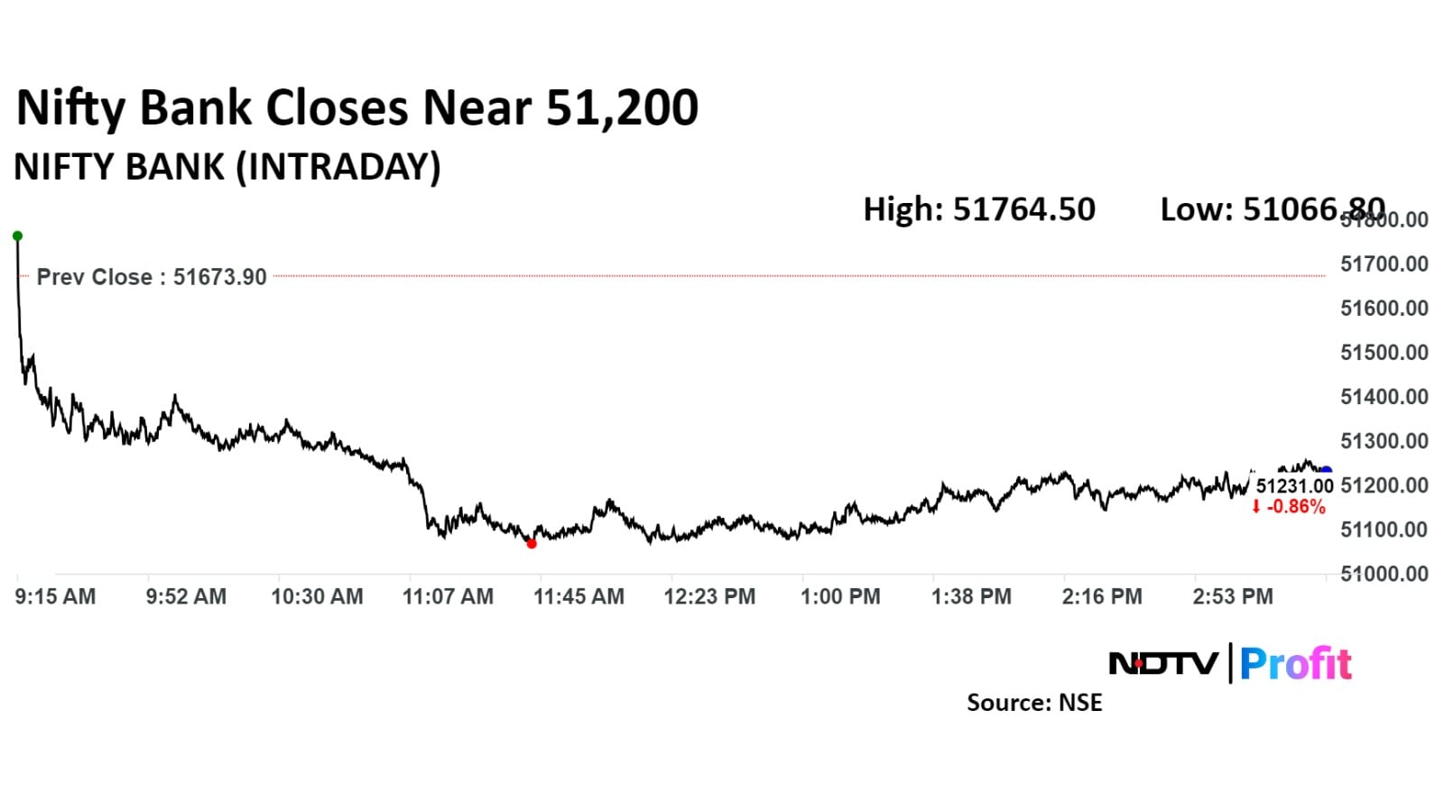 The Nifty Bank ended 0.86% down at 51,231.00.
