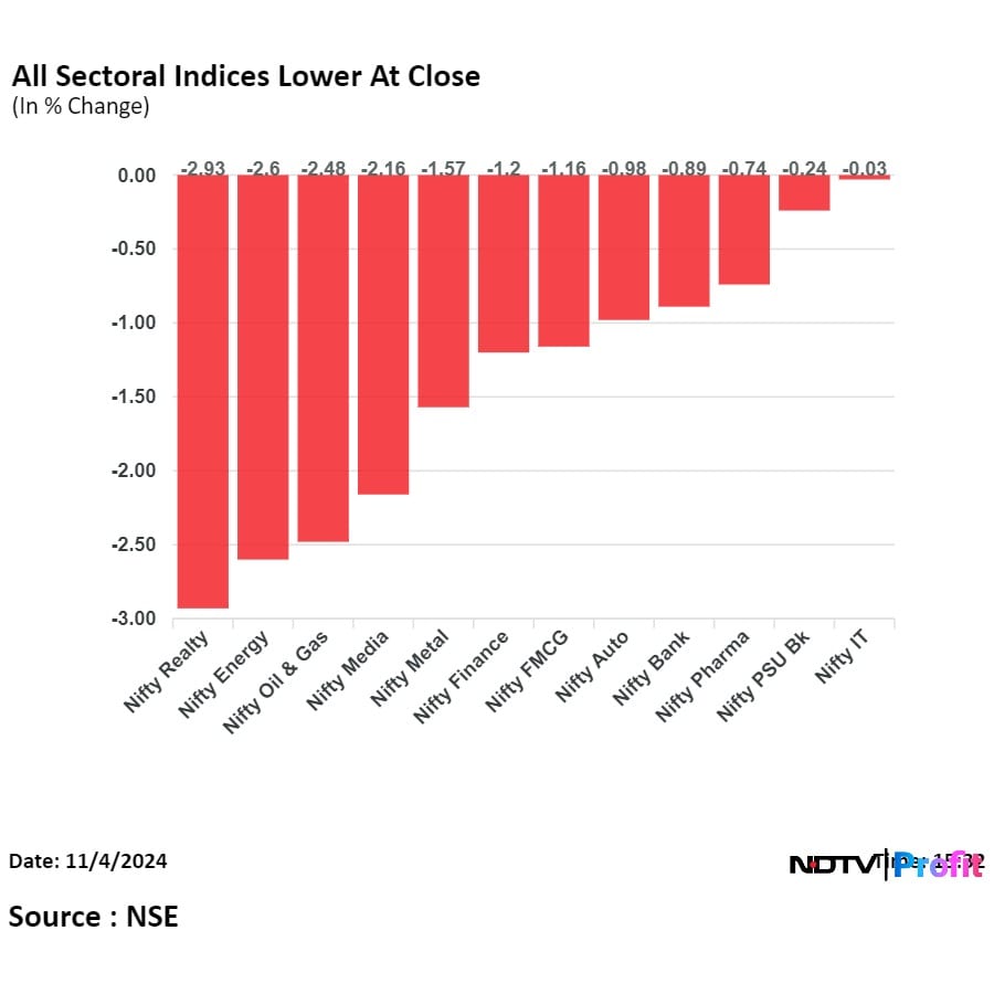 On NSE, all 12 sectors ended lower, with the NSE Nifty Realty declining the most.