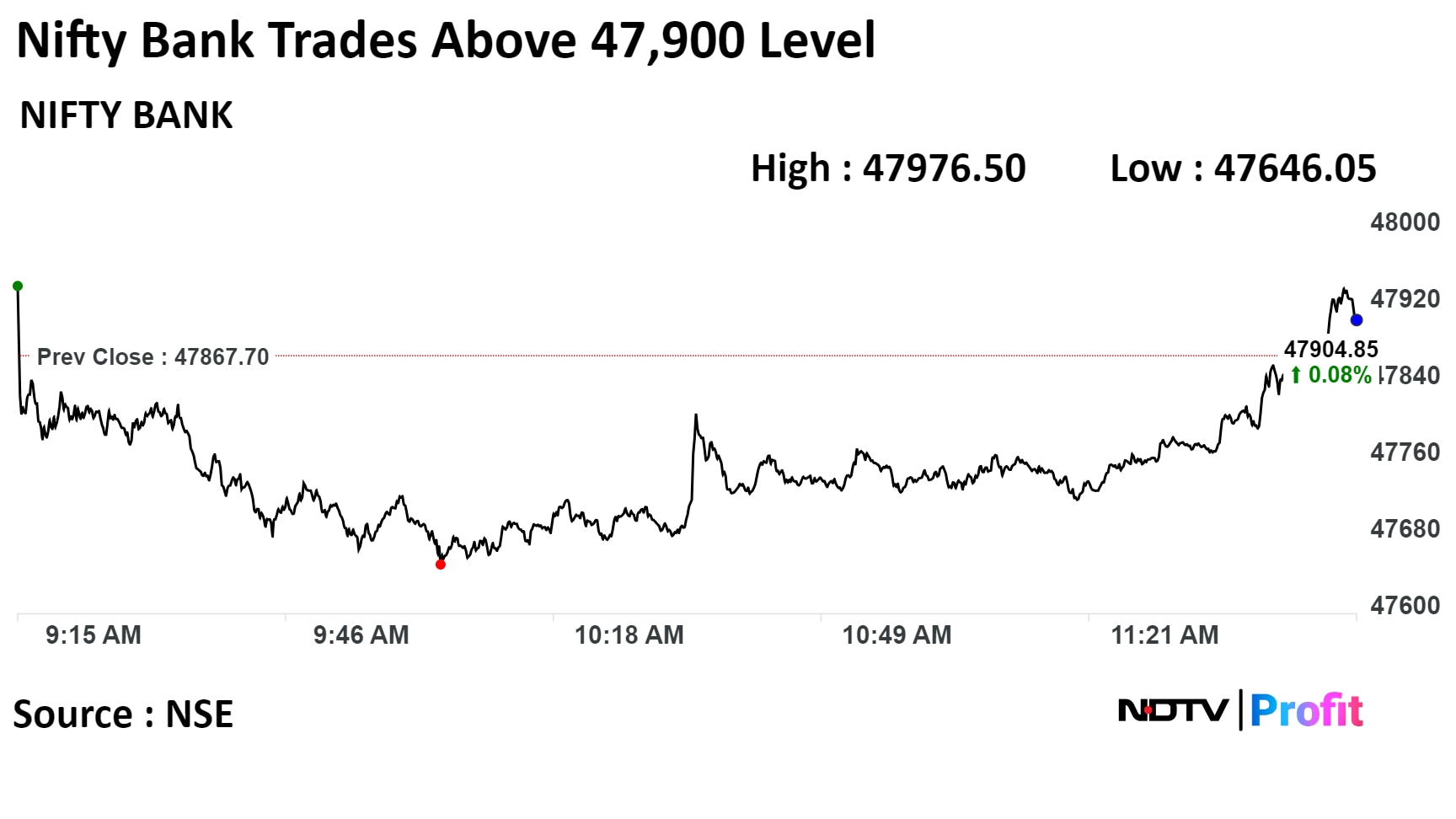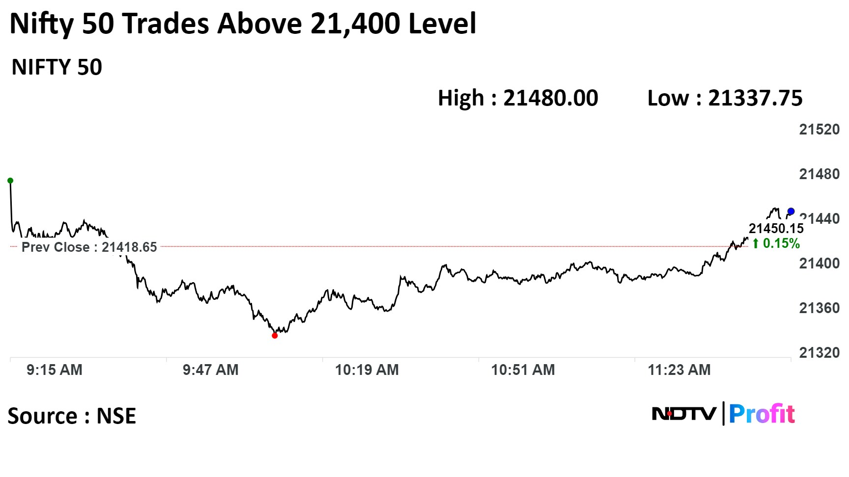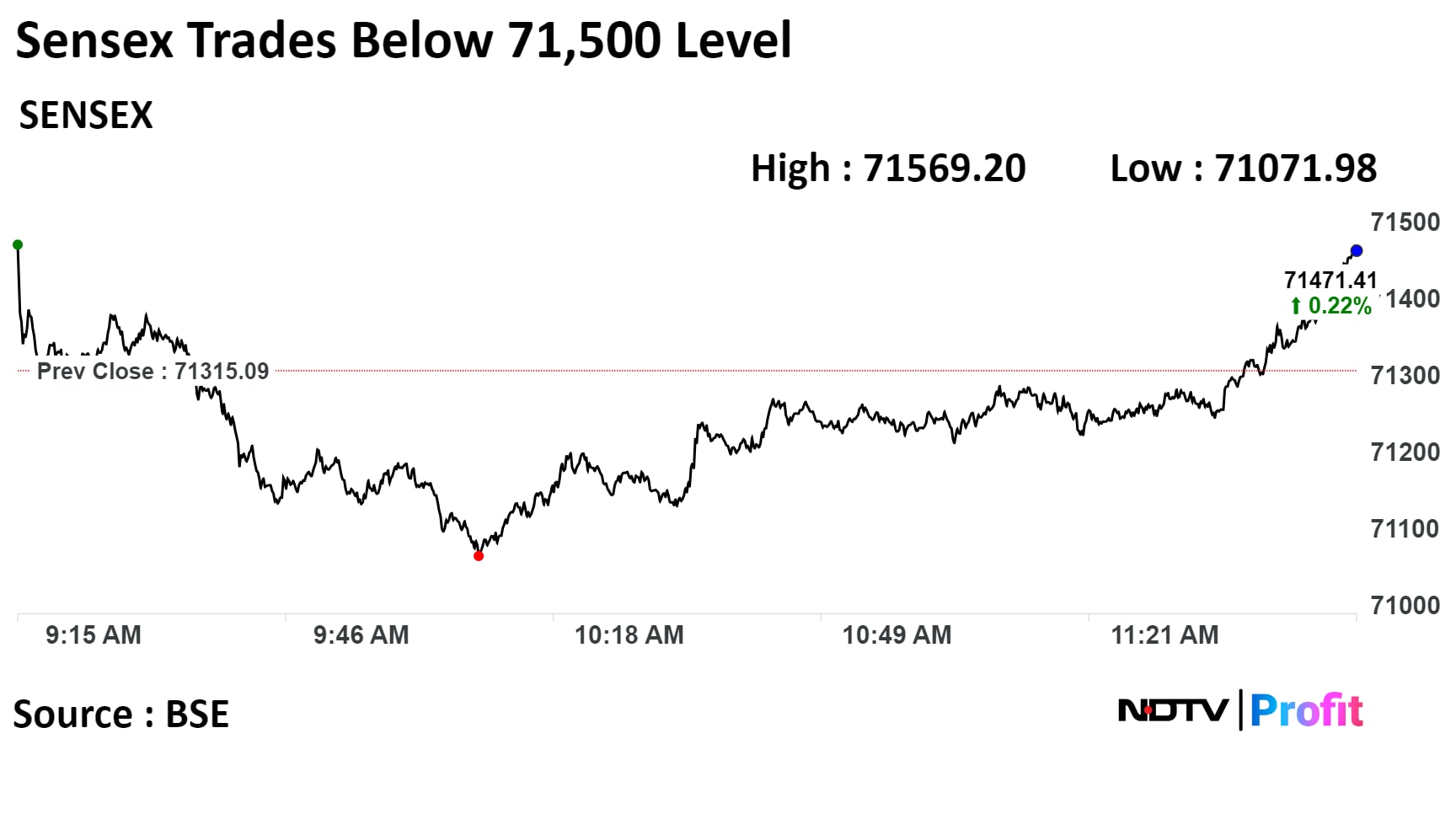 At 11:49 a.m., the NSE Nifty 50 was trading 17 points or 0.08% higher at 21,436.05, while the S&P BSE Sensex was 96 points or 0.14% up at 71,411.43.