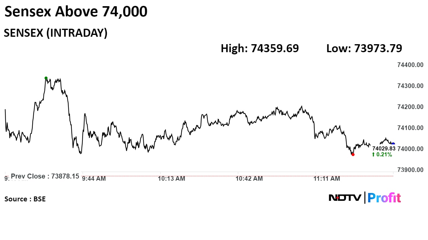 As of 12:09 p.m., the NSE Nifty 50 was trading 42.70 points, or 0.19%, higher at 22,518.55, and the S&P BSE Sensex gained 252.25 points, or 0.34%, to trade at 74,130.40.