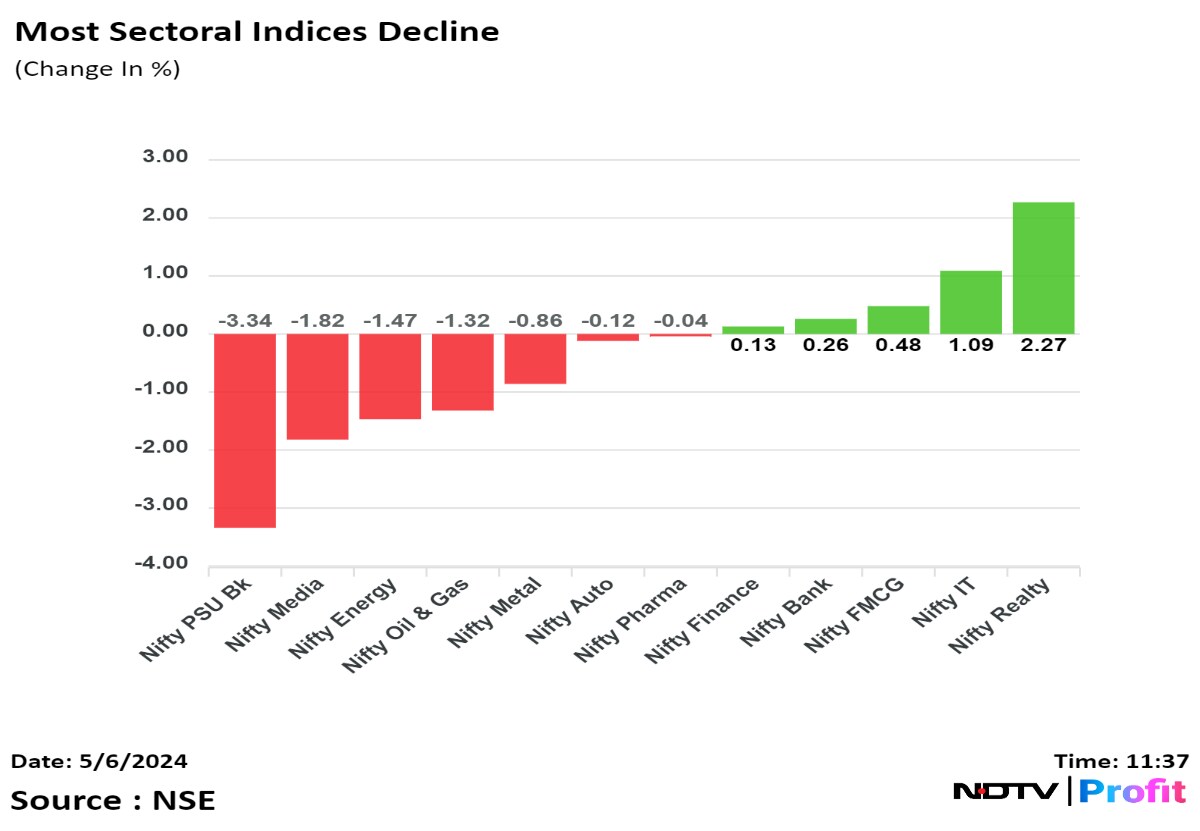 On NSE, seven sectors declined and five advanced. The NSE Nifty PSU Bank fell the most, and NSE Nifty Realty advanced the most.
