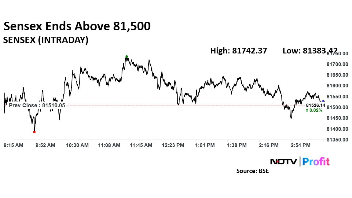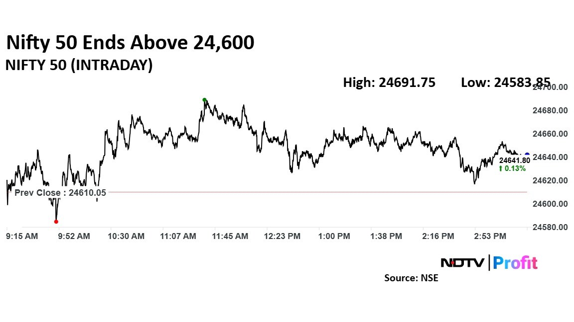 The Nifty ended 31.75 points or 0.13% higher at 24,641.8 and the Sensex closed 16.09 points or 0.02% up at 81,526.14. During the day, both the Nifty and Sensex had risen 0.3%.