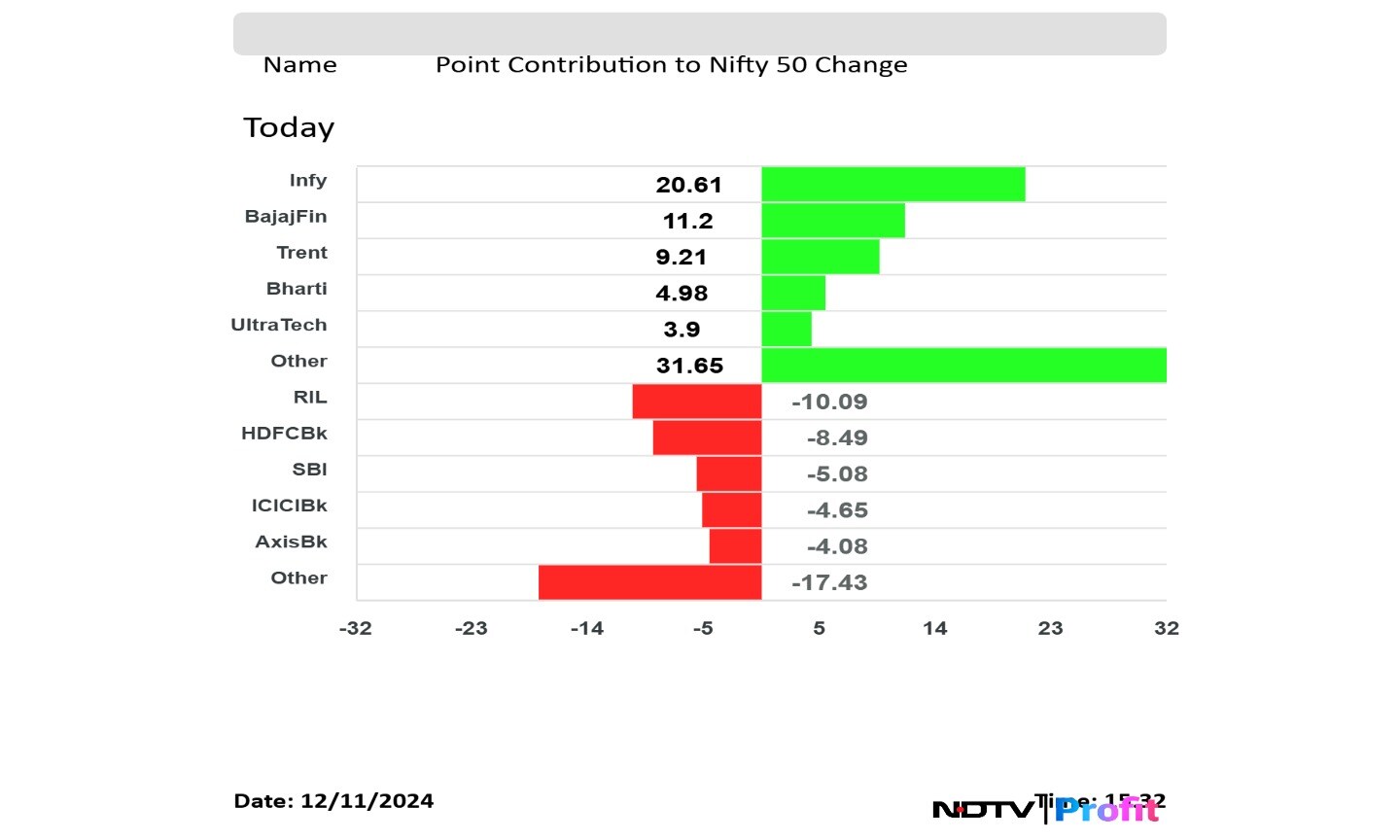 Shares of Infosys Ltd., Bajaj Finance Ltd., Trent Ltd., Bharti Airtel Ltd. and UltraTech Cement Ltd. contributed the most to the gains in the Nifty.