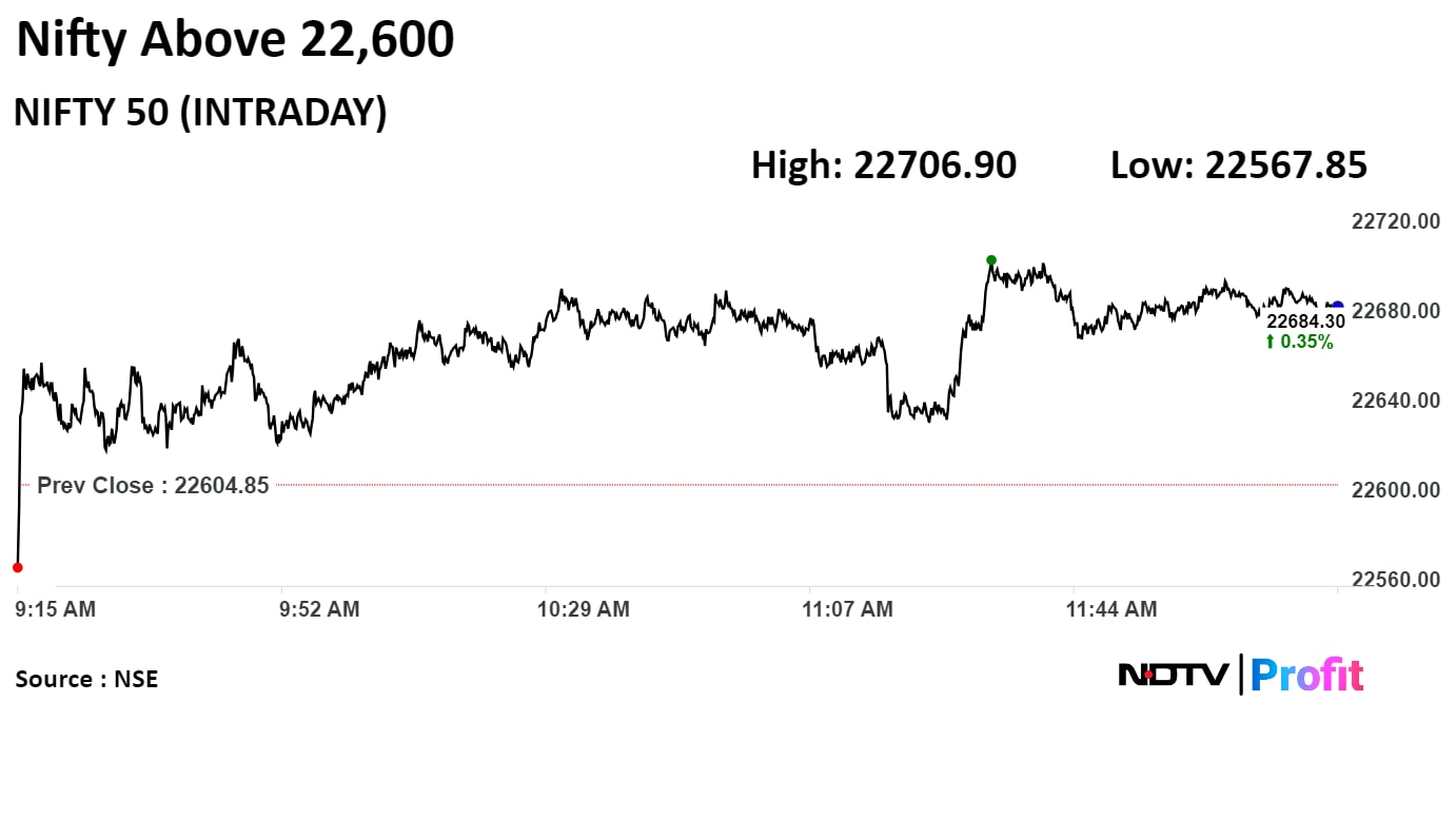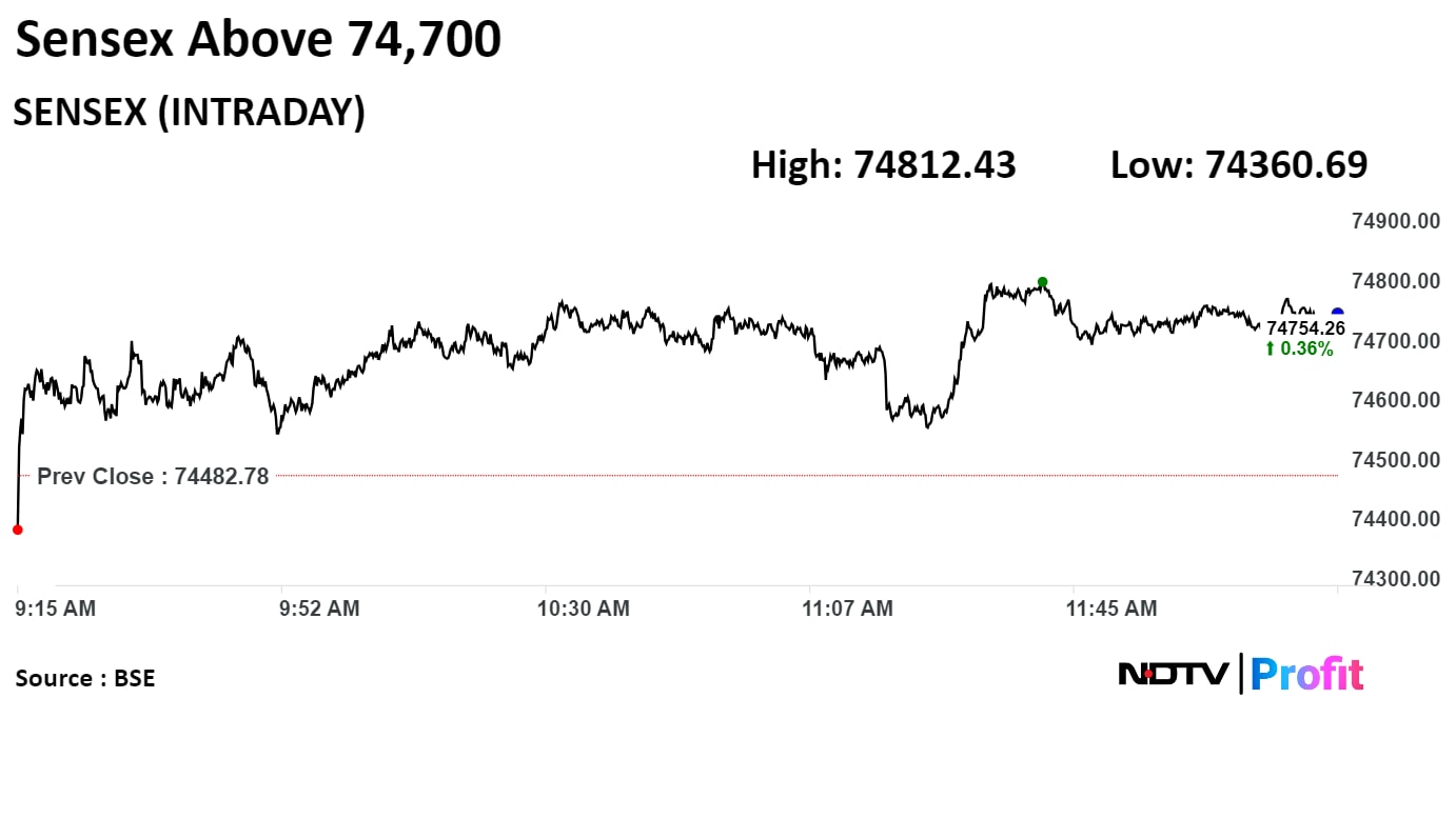 As of 12:55 p.m., the NSE Nifty 50 was 74.55 points, or 0.33%, higher at 22,679.40, and the S&P BSE Sensex gained 223.79 points, or 0.30%, to 74,706.57. The Nifty rose 0.45% to 22,706.90 and Sensex rose 0.44% to 74,812.43 so far in the day.