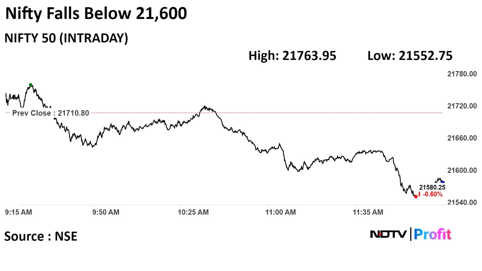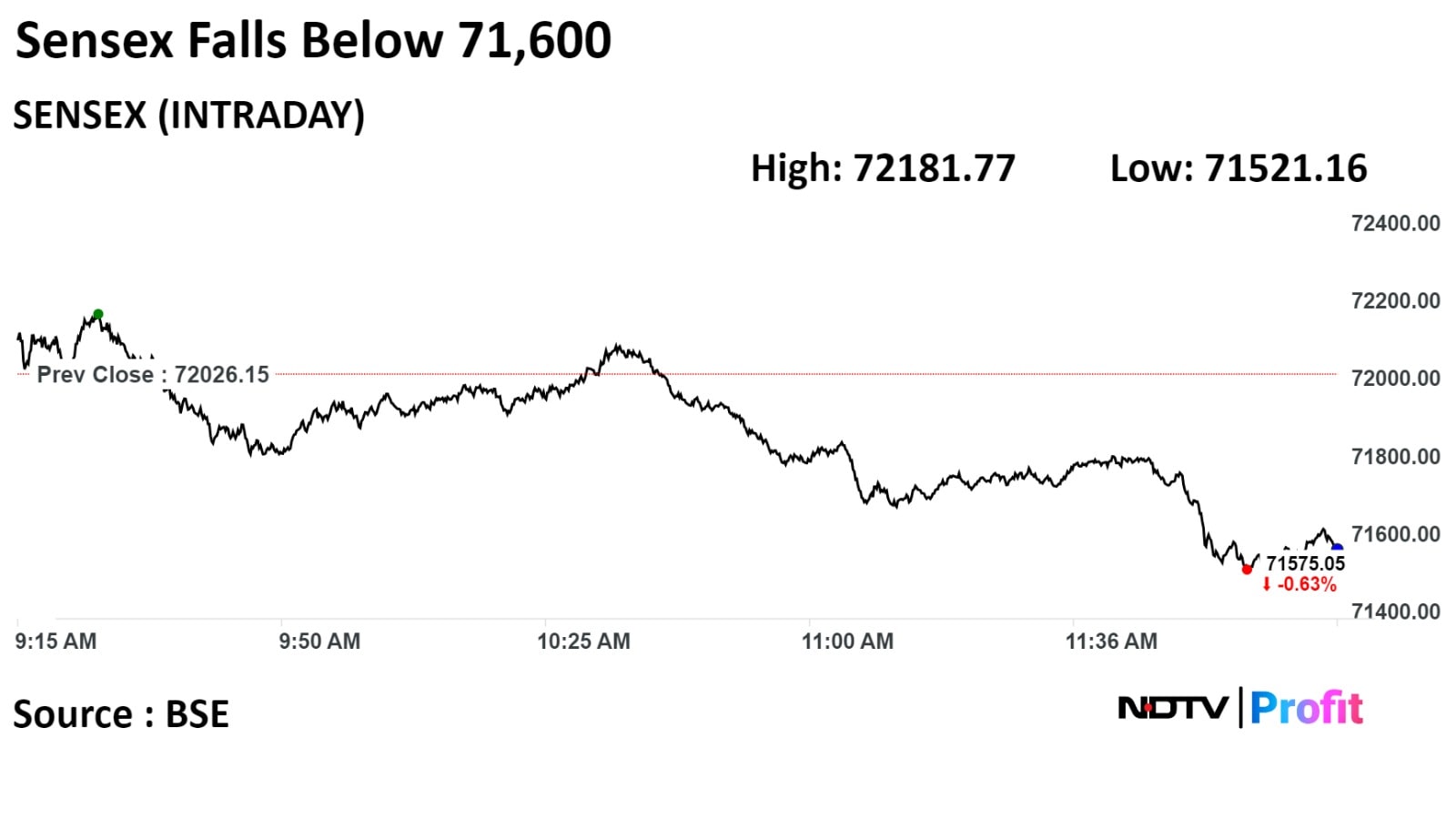 As of 12:30 p.m., the NSE Nifty 50 fell 123 points or 0.57% to 21,587.40, while the S&P BSE Sensex declined 408 points or 0.57% to 71,618.32. The Nifty hit intraday low of 21,552.75 and the Sensex fell to a low of 71,521.16.
