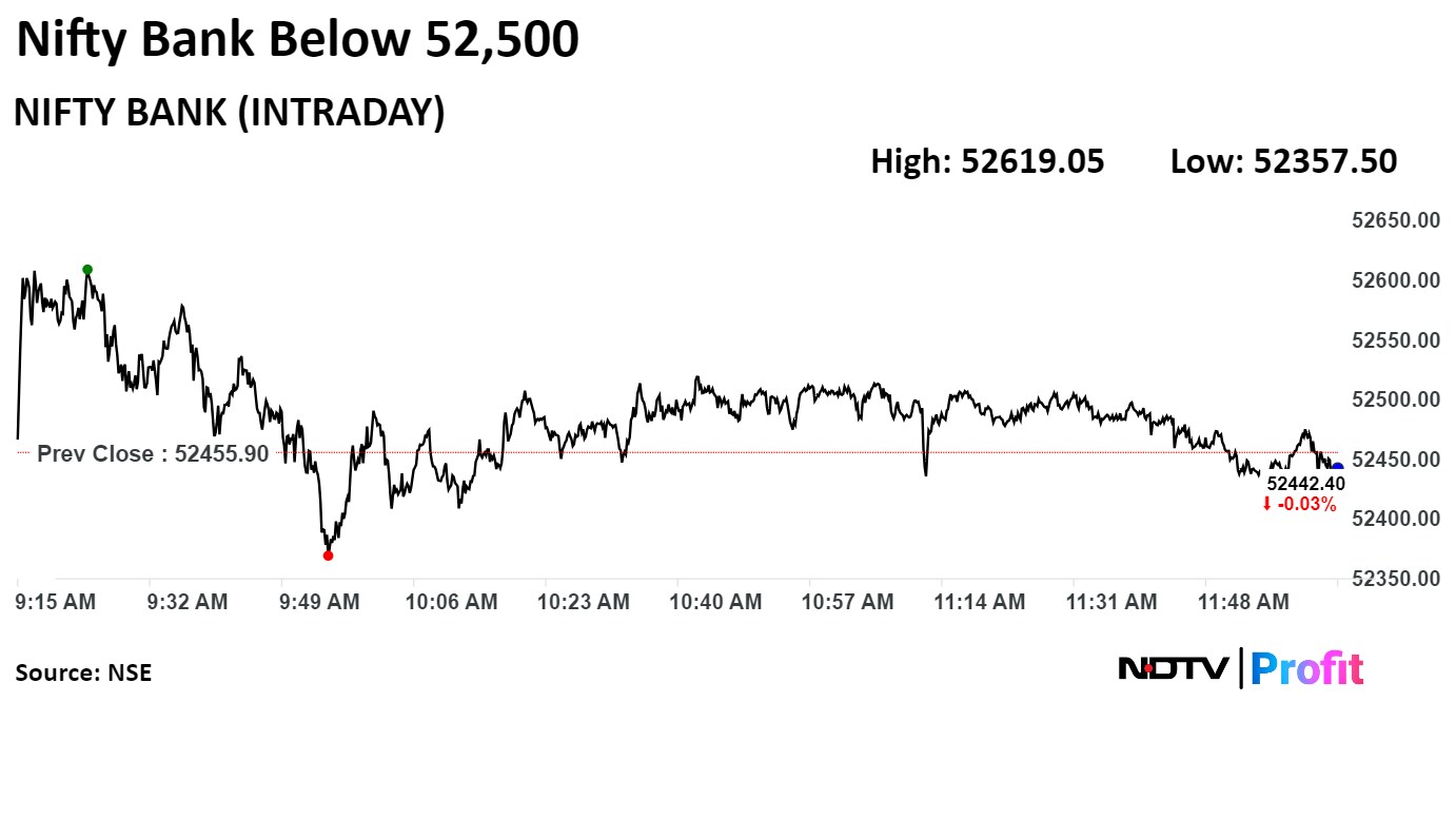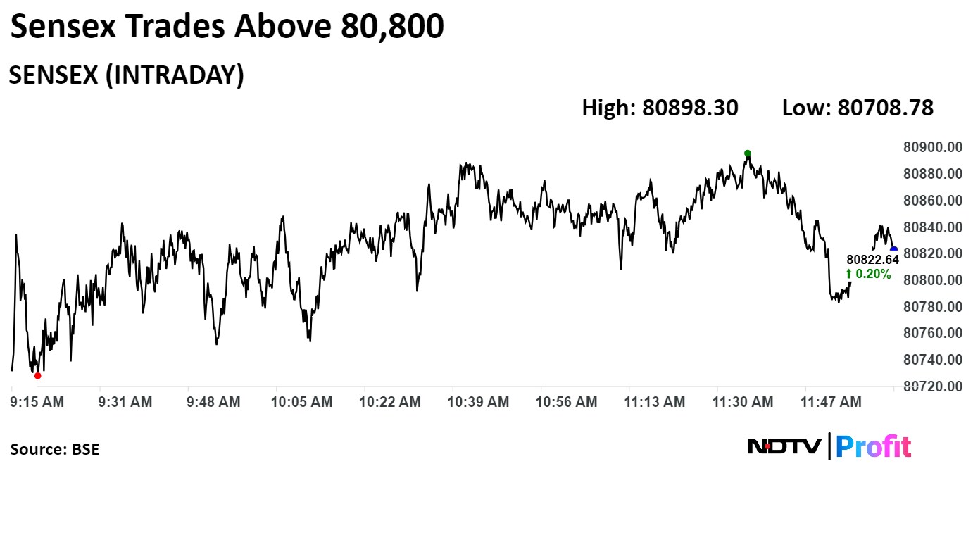 As of 12:15 p.m., the NSE Nifty 50 was trading 54.05 points or 0.22% higher at 24,640.75, and the S&P BSE Sensex was 153.47 points or 0.19% up at 80,818.33.