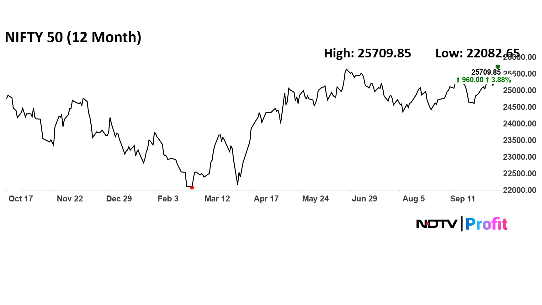 Intraday, the Nifty hit 25,781, the highest level since mid-October 2024. The 50-stock index is just shy of 500 points from its all-time peak. Telecom, auto and oil and gas sectors contributed the most to gains in the 12 months.
