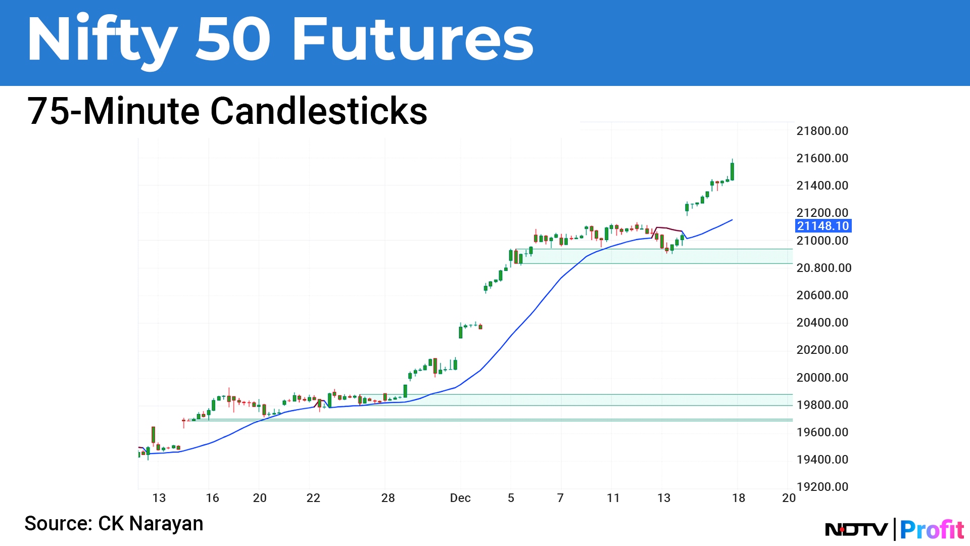 The value zone of last week's sup-res level (rectangle) is left far behind by the sheer pace of advance of the week ended. Market also ran away from the trailing Gann trend indicator. So those two, which we can use as a reliable support zone (and hence, a stoploss area) are far away, at 21140-20900 area. Maybe a bit much for a day trader. They may have to look at similar set ups in, say, a 30min chart where these levels would project a stop area around 21,425-21,375. Of course, these levels will move higher as the week ahead unfolds.