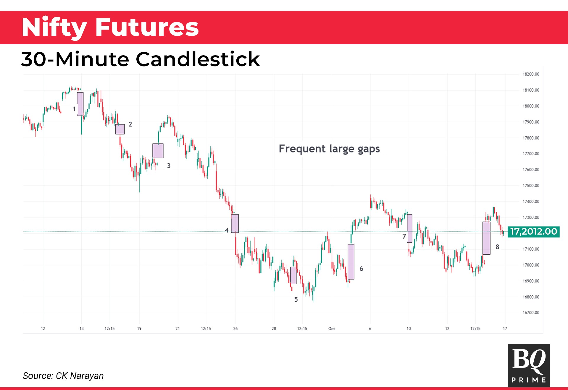 We had enough dope to go lower as the US markets, too, were on a slide with poor macro numbers and our own rupee on a slide. But note how directional moves would simply not emerge. Trading was really tough during the week, if you were a directional player. In fact, over the last one-month, frequent large gaps have been a disconcerting feature. This is shown in chart 2.