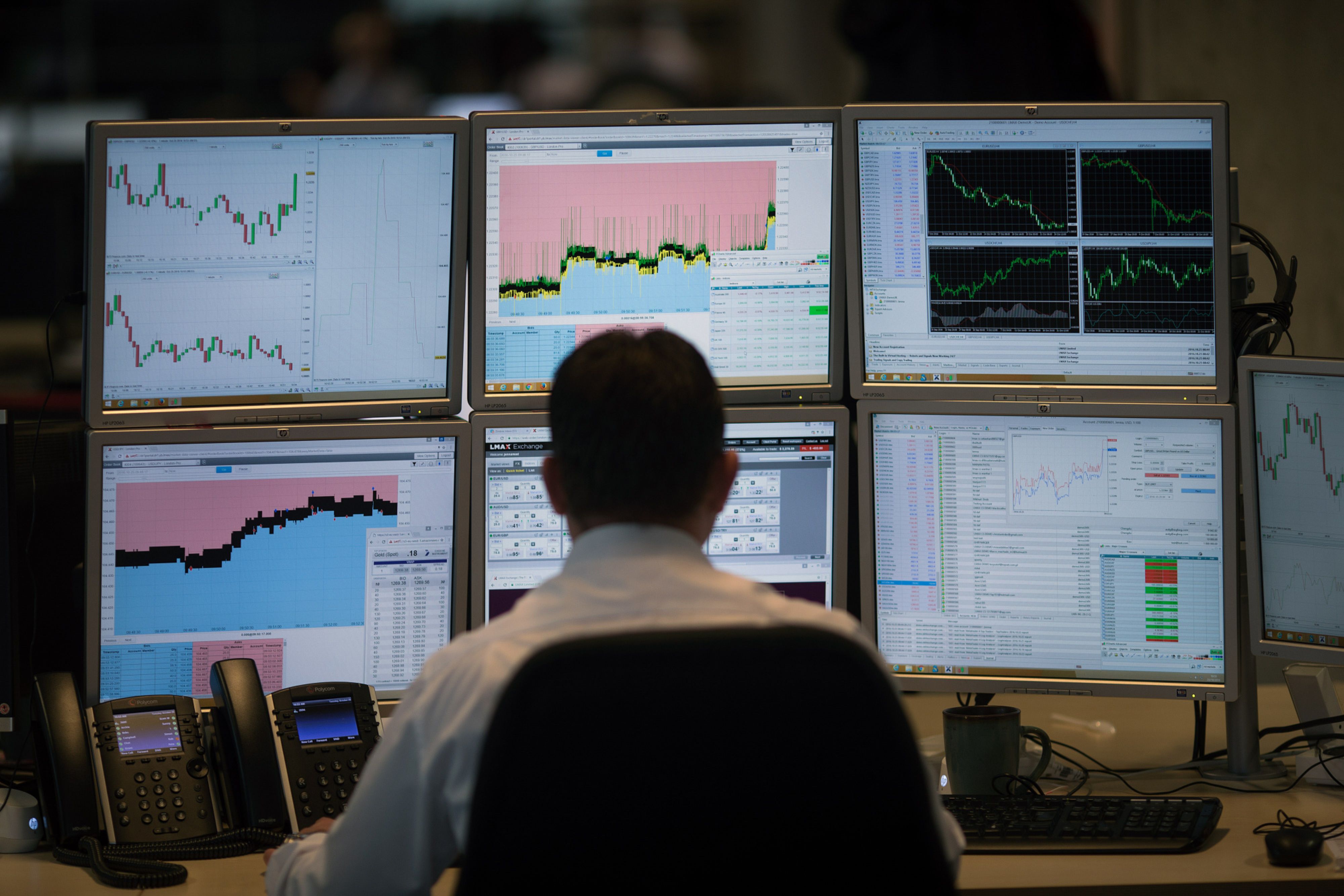 A trader looks at information on computer screens. (Photographer: Simon Dawson/Bloomberg)