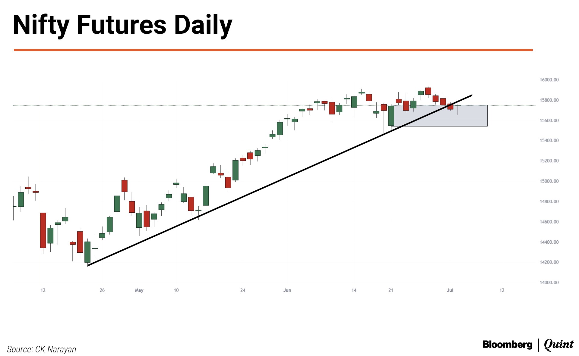 The break of the trendline is a warning. Now, see the small rectangle that has been drawn encompassing the bullish candle range of June 21. This is the counterattack of the bulls. Now, if this zone is compromised, then you can conclude that the bears mean more of a business this time. Now the rise to a new high happened in six sessions after the June 18 low. If we retrace that in lesser time (i.e. less than six days, of which four are over as of Friday) then we will have a signal of a change in direction or the swing (but not the trend, please note). This needs to, therefore, happen by Tuesday next week. If later, then it shall be a small change in only the swing.