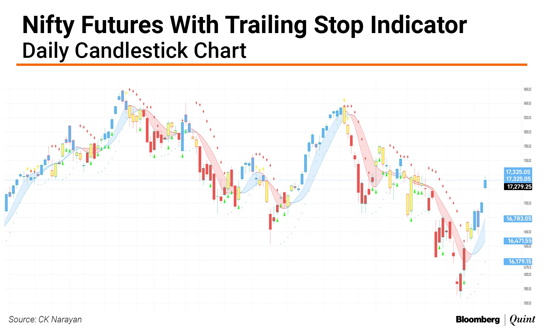 We are all happy if markets go higher. But prudence demands that we also protect the downside. For that, we have the setup shown in the fourth chart where a trailing stop type indicator shows two levels 16,470 and 16,783 at the start of the week as the area that should ideally hold during any pullbacks.