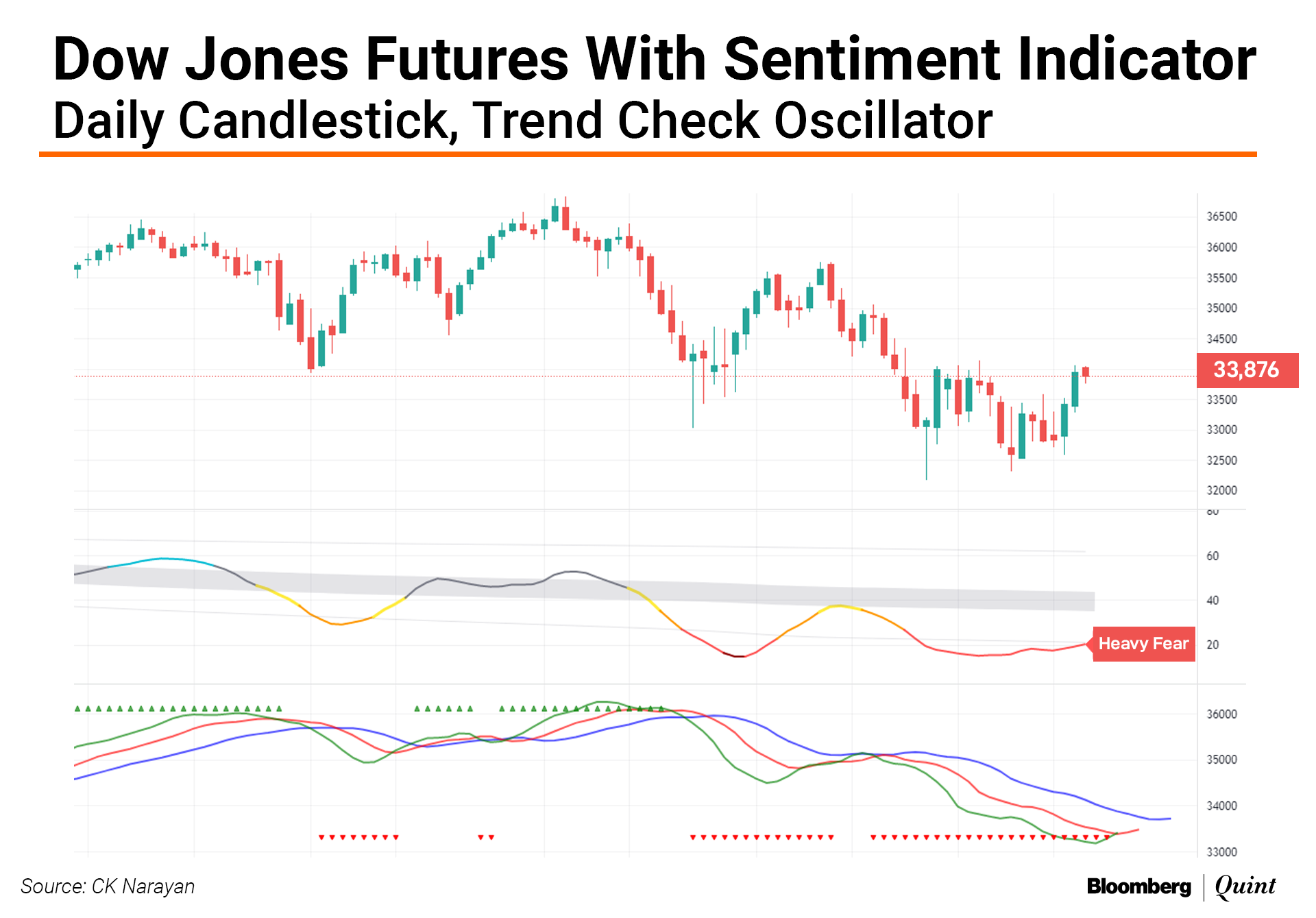 If we shift our focus outward and look at what the Dow Jones Futures are telling us, then the news is quite similar or worse. The third chart shows the Dow Jones situation, using the same indicators as above. Note that the sentiment there still reads Heavy Fear. Even Bitcoin charts have been unable to shake off the pressure.