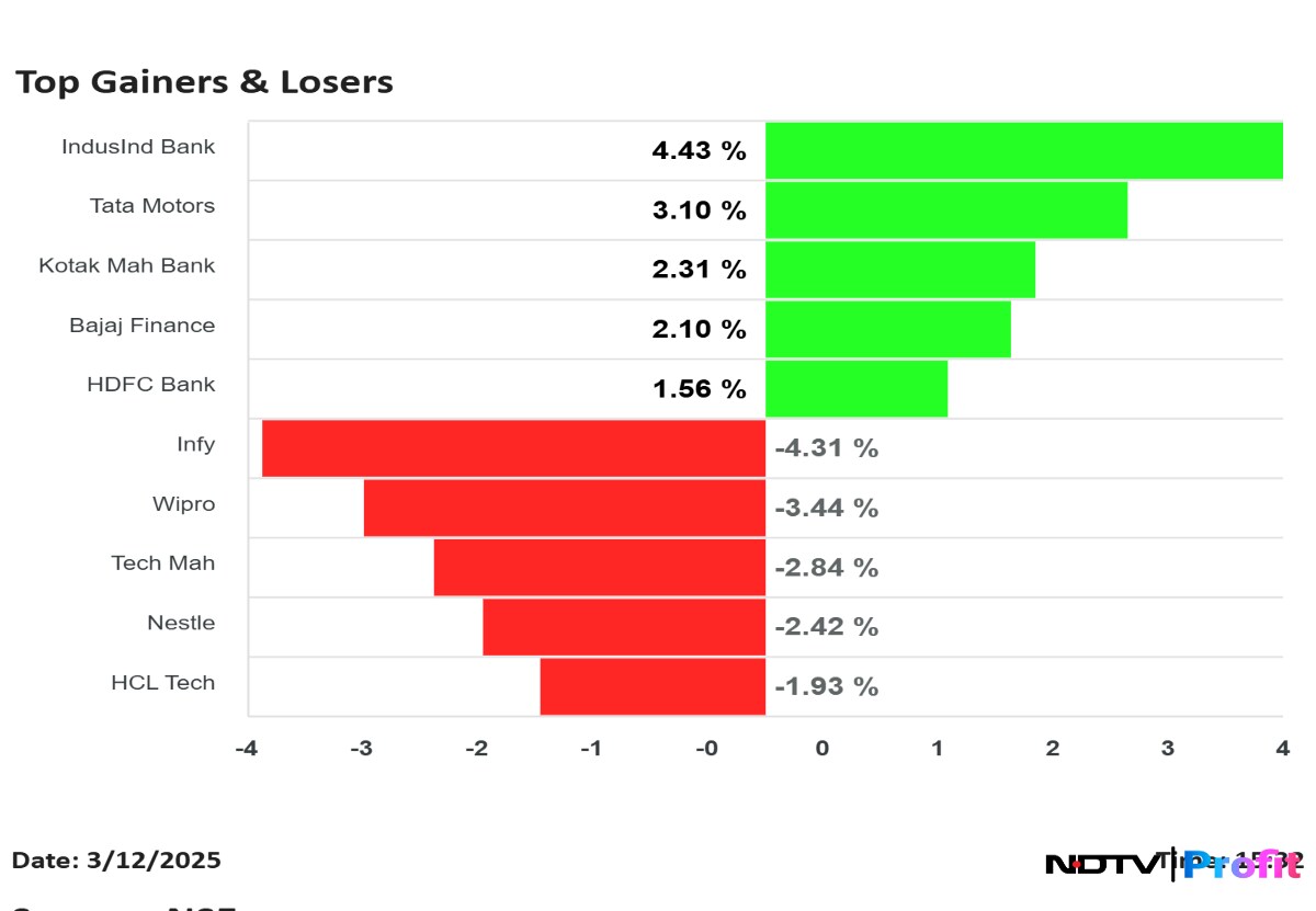 Shares of IndusInd Bank Ltd. and Tata Motors Ltd. were the top gainers on Wednesday, while IT stocks led by Infosys Ltd. and Wipro Ltd. fared the worst on the Nifty.