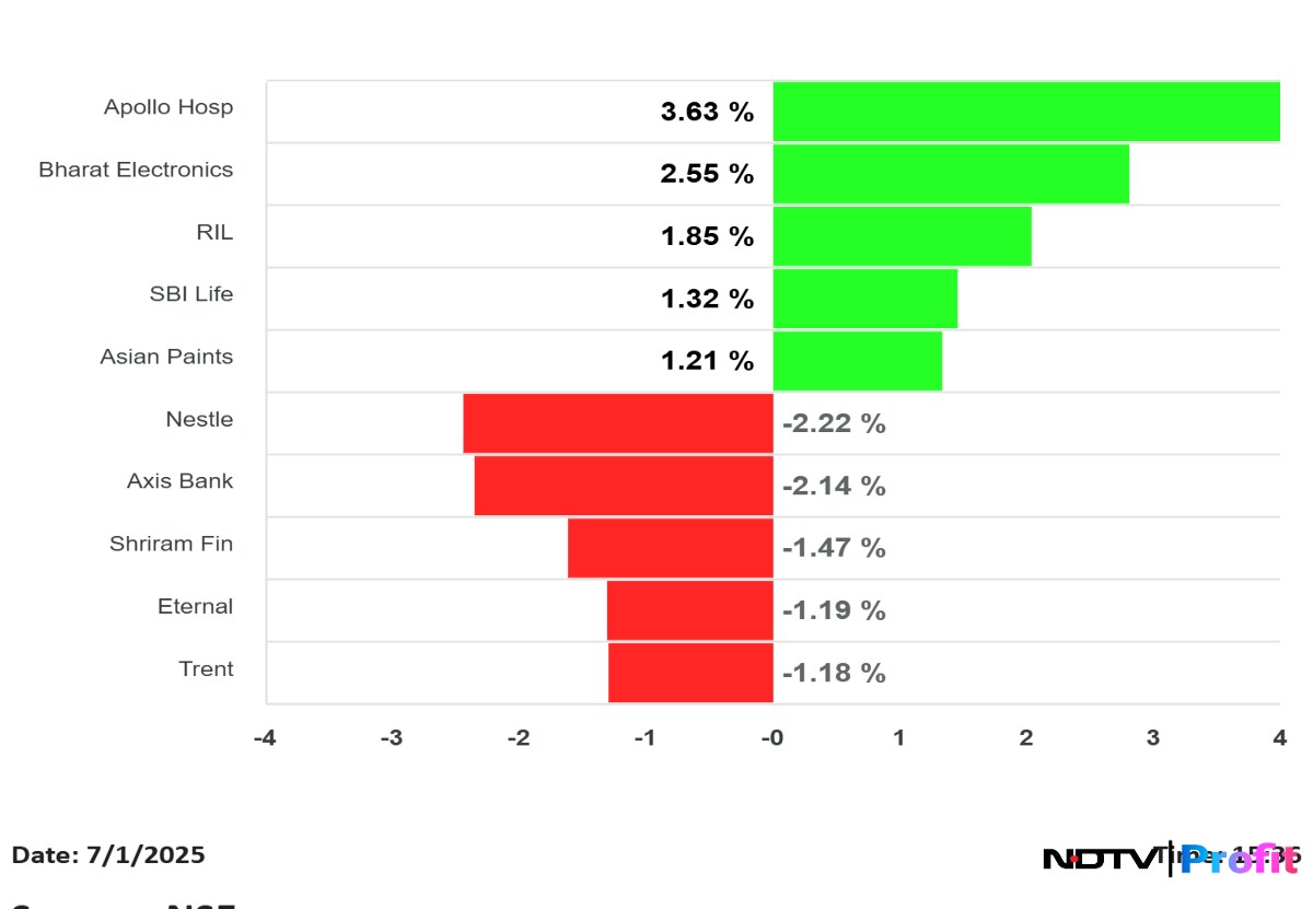 Apollo Hospitals Enterprise Ltd., Bharat Electronics Ltd., Reliance Industries Ltd., SBI Life Insurance Co. and Asian Paints Ltd. were among the top gainers on the NSE Nifty 50 on Tuesday.