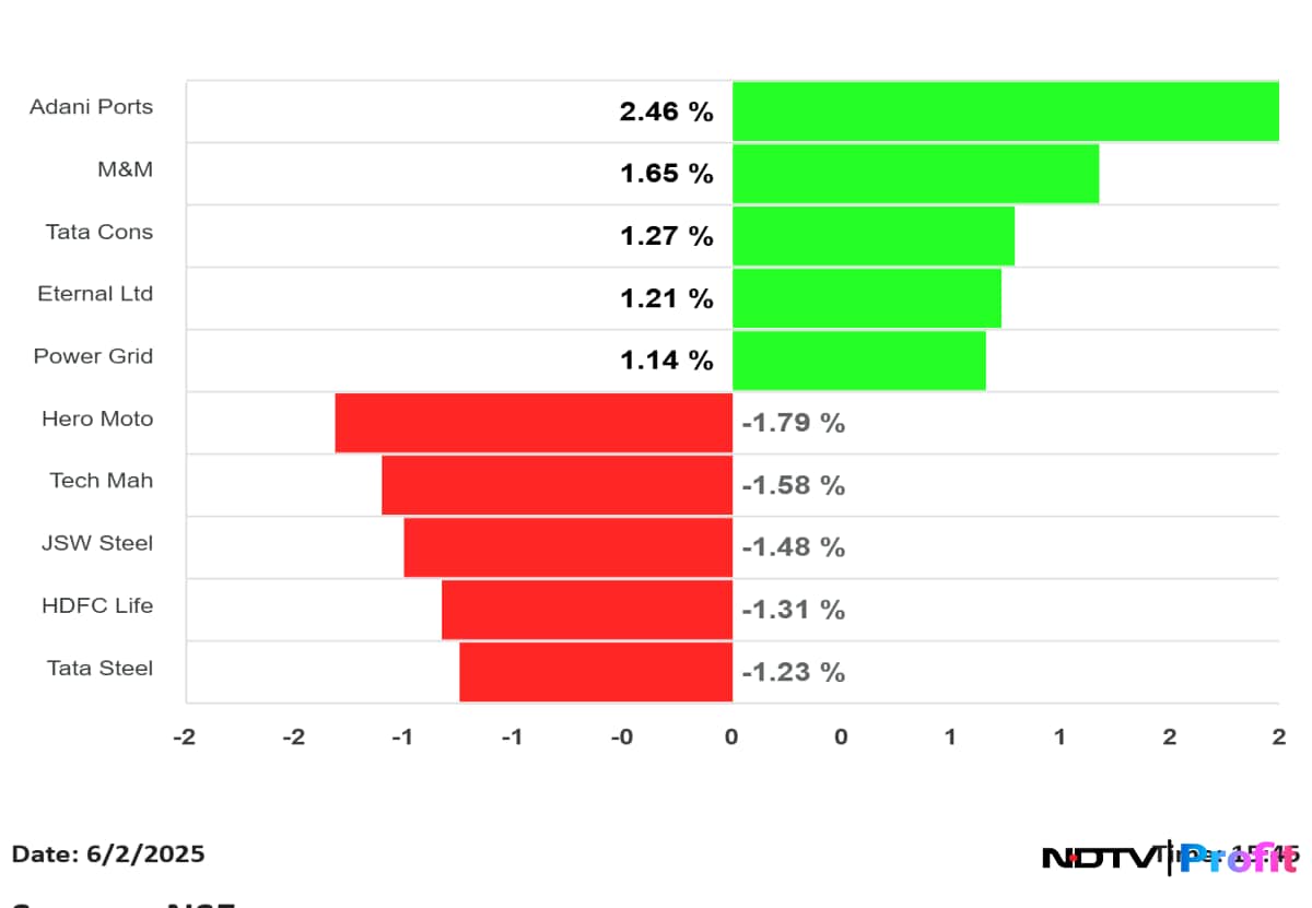 Adani Ports closed 2.46% higher at Rs 1,468 apiece, followed by M&M that ended 1.65% up at Rs 3,025.9 apiece. TCS closed 1.27% higher at Rs 1,120.40 apiece. Eternal gained 1.21% to Rs 241 per share, while Power Grid closed 1.14% up at Rs 293.05 apiece.