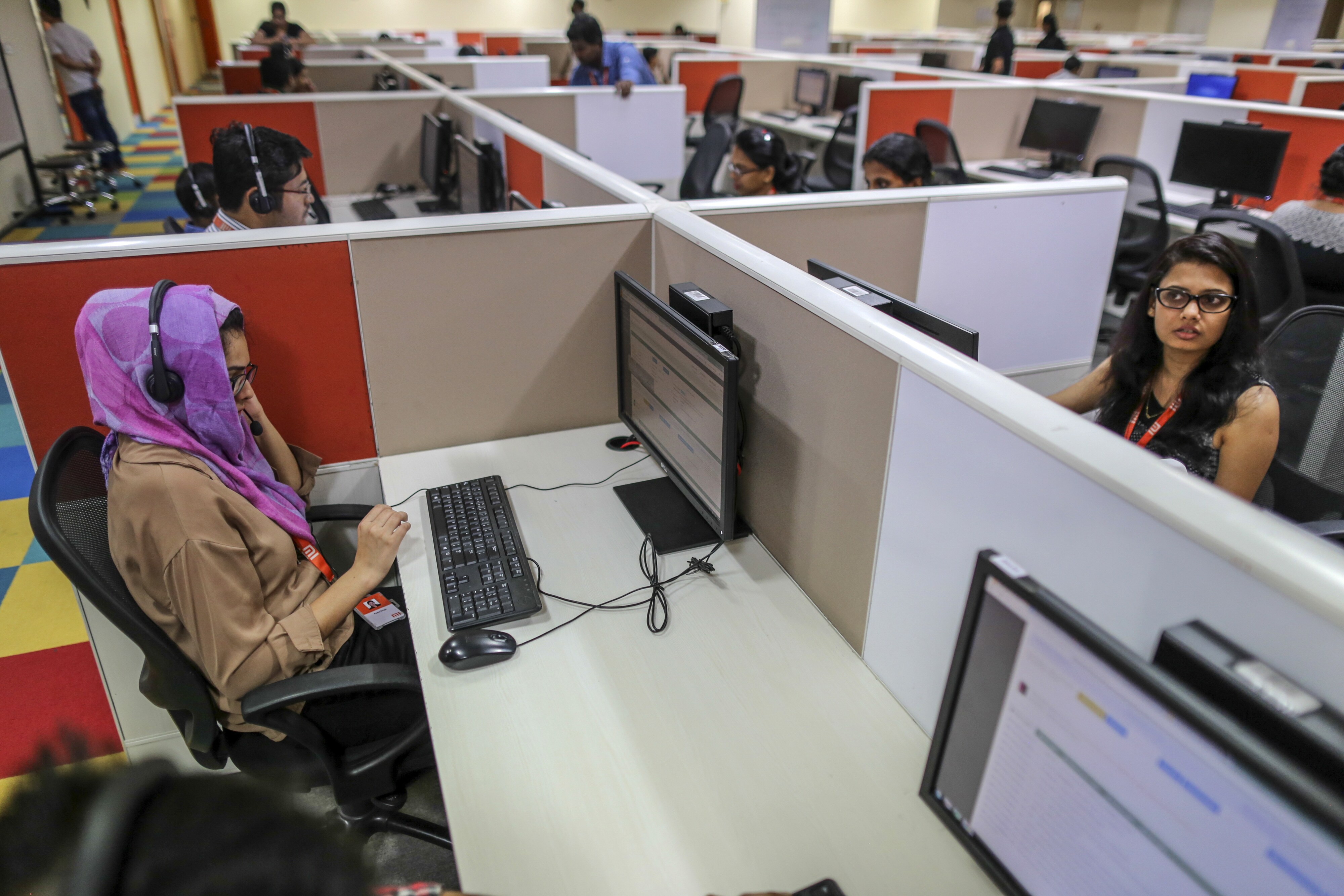 An employee uses a headset to speak to a customer at a call cente in Bengaluru, India. (Photographer: Dhiraj Singh/Bloomberg)