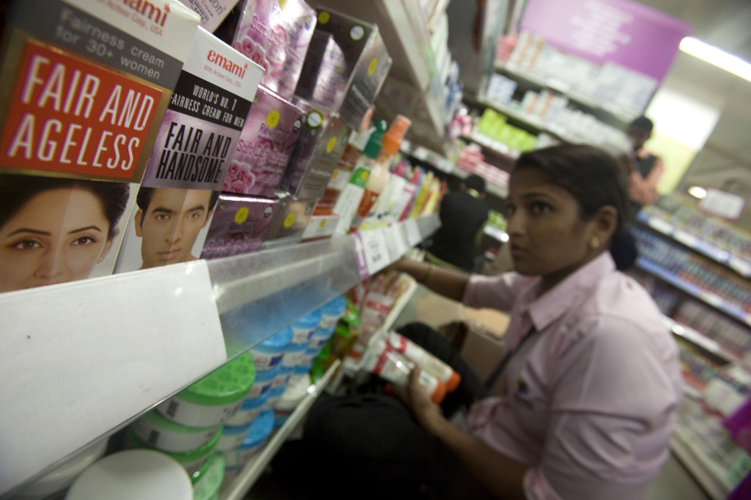 A store keeper arranges beauty and whitening products, including Emami Ltd.’s “Fair and Handsome” at a Big Bazaar outlet in Mumbai, India. (Photographer: Prashanth Vishwanathan/Bloomberg)