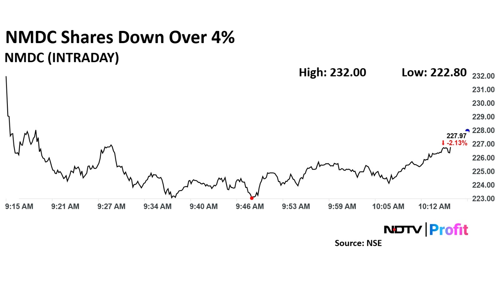NMDC share price fell as much as 4.35% during the day to Rs 222.80 apiece on the NSE. It was trading 3.56% lower at Rs 224.63 apiece, compared to an 0.10% advance in the benchmark Nifty 50 as of 10:08 a.m.