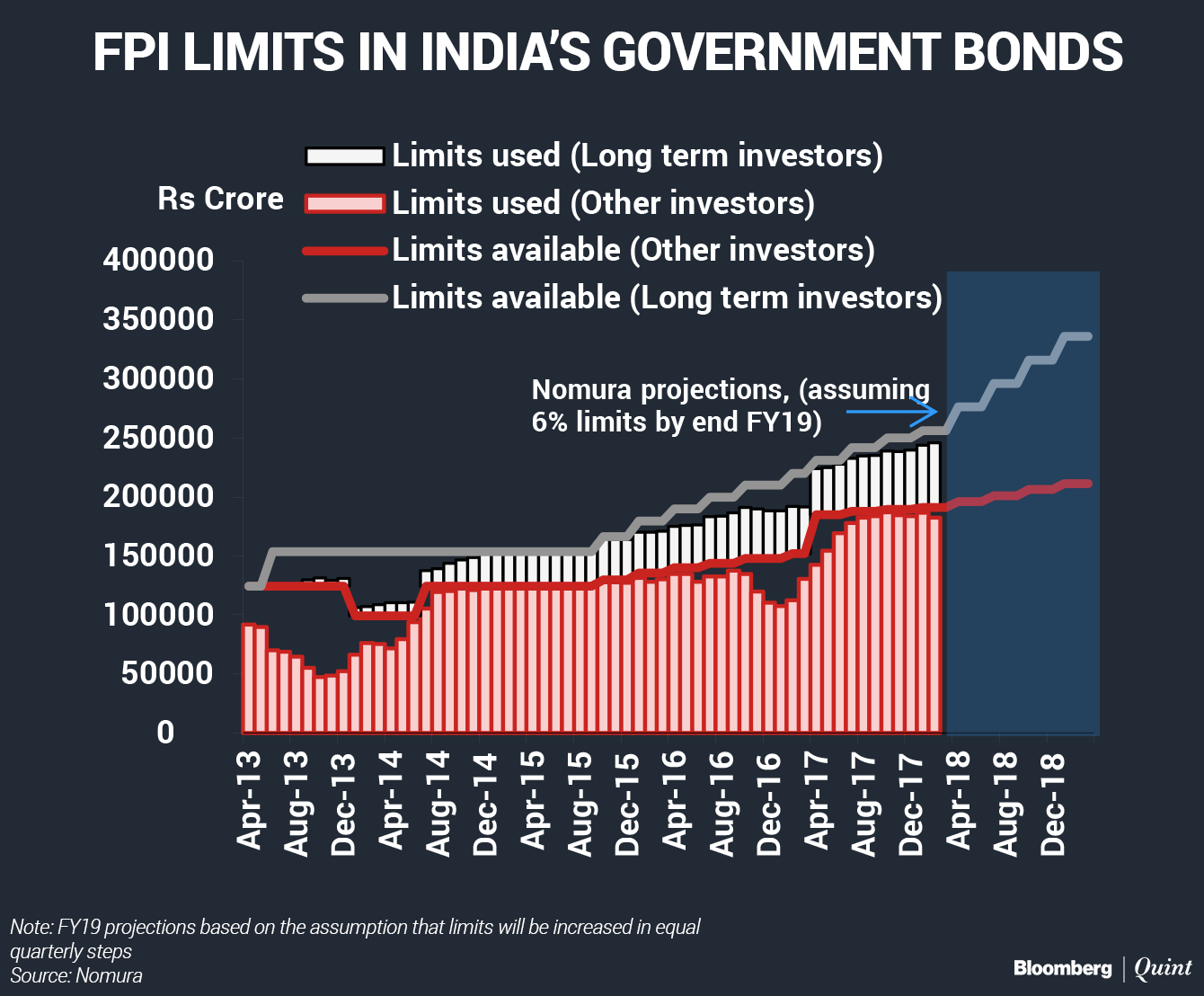Currently, foreign portfolio investments are capped at 5 percent of the total outstanding government bonds. And the net supply for the upcoming fiscal is budgeted at around Rs 4.62 lakh crore. Thus, foreign investors won't be able to buy more than Rs 24,000 crore worth of such bonds. “This, in our view, would be too little to compensate for lack of bank demand in the bond market,” Nomura said.