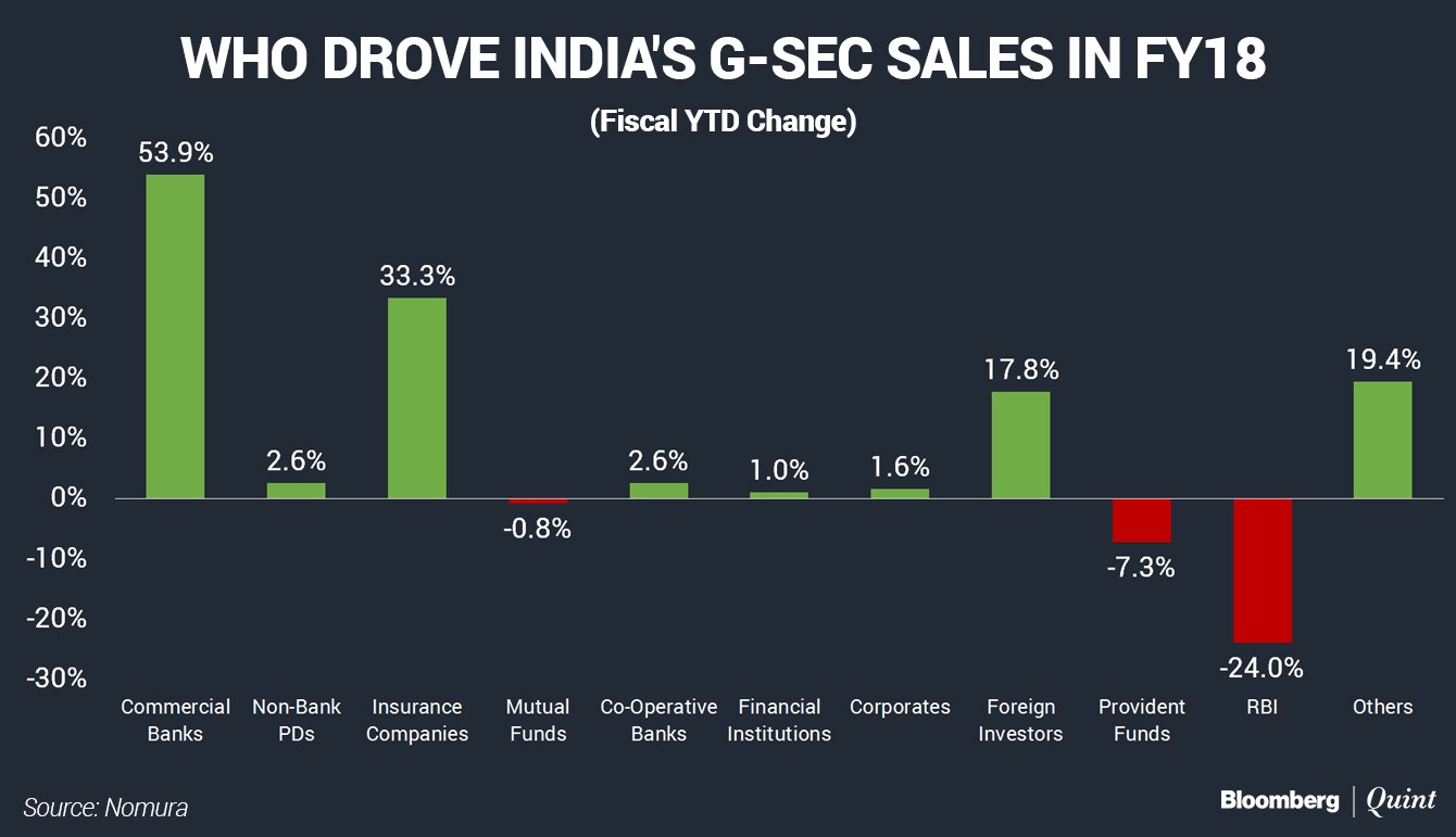 Bond sales in India have been driven largely by commercial banks and insurance companies. In 2017-18, more than half of the supply was absorbed by lenders, followed by insurers and foreign investors. Liquidity at banks has swelled up since the government's cash purge in November 2016. Now the statutory liquidity ratio in India's banking system is estimated at 29.6 percent, according to Nomura. That's well above the 19.5 percent ratio the Reserve Bank of India requires them to maintain.