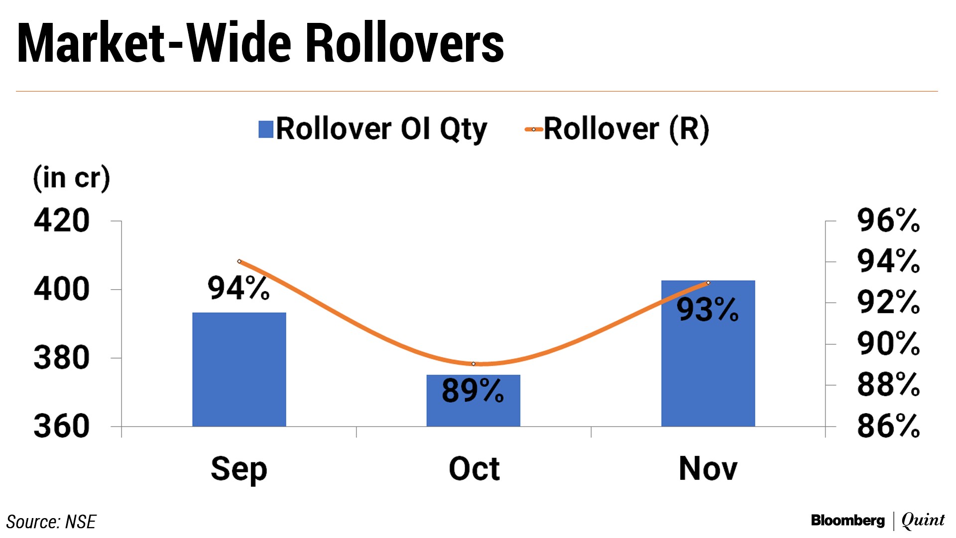 The rollovers across stock futures were higher at 93 percent with an open interest of 403 crore shares compared with 375 crore shares in the previous contract. The market-wide rollover in November contracts was 89 percent. Open interest was higher on the back of follow-up buying interest seen in the midcap space.