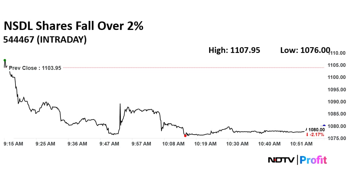 Shares of National Securities Depository Ltd. extended its decline for the fourth day with the stock falling 2.53% to Rs 1,076 apiece. Despite the correction, the share price is trading higher than its initial public offering price of Rs 800.